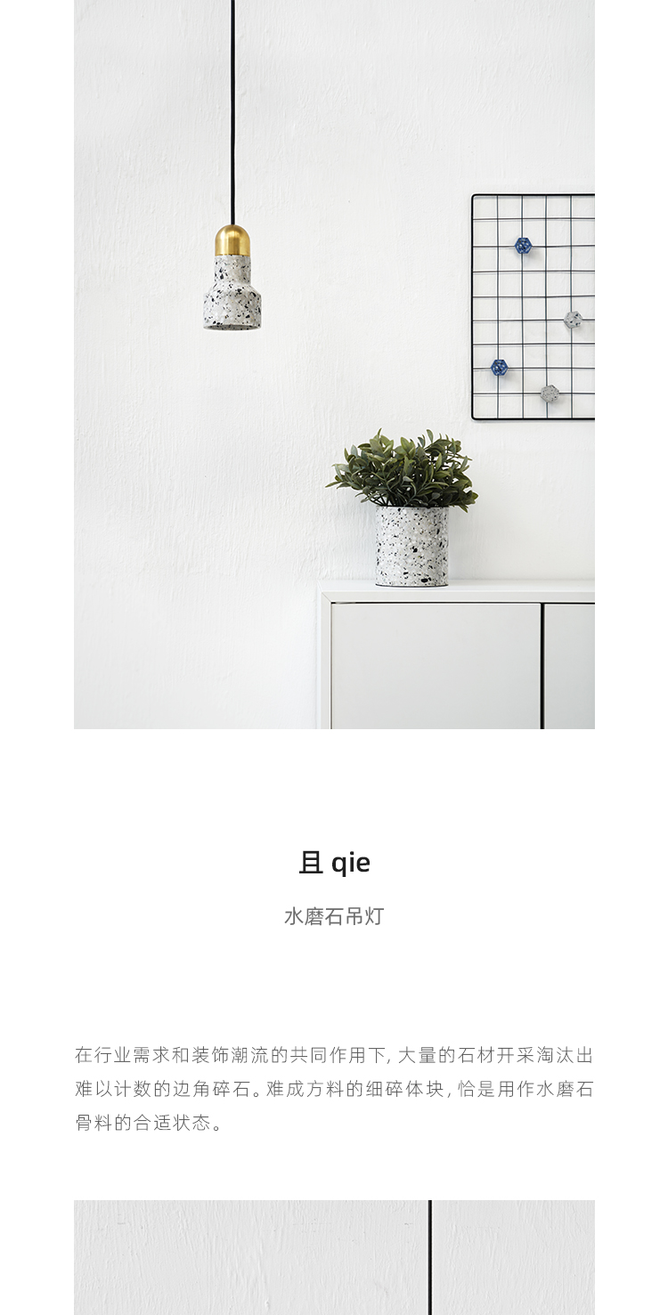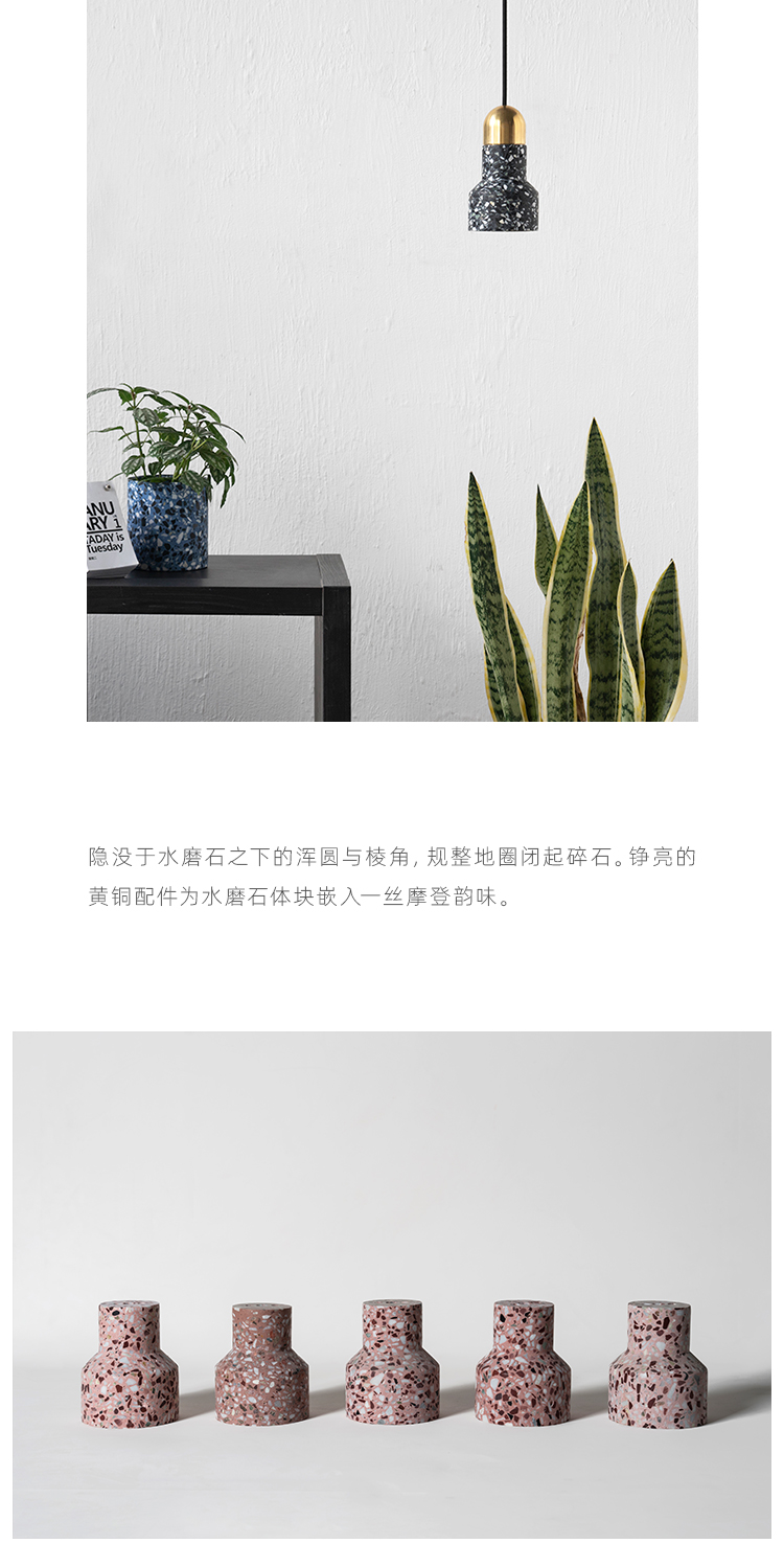 以材质再生为基本手段的水磨石系列,将陶瓷废渣再生成简洁形态的日常性家具,以衍生产业的形式回归到大众层面的使用中。 中国佛山,这片拥有全球最大最成熟的陶瓷产业链和产业集群的建筑陶瓷工厂的土地,承载着每年400万吨陶瓷废弃物带来的环境污染。 以材质再生融入日常,不仅是激发商业价值的大胆尝试,是环保理念的日常化实践,更是对自我尊严的基本坚守和追求,我们探寻陶瓷跨越地域局限的一种当代突破!
