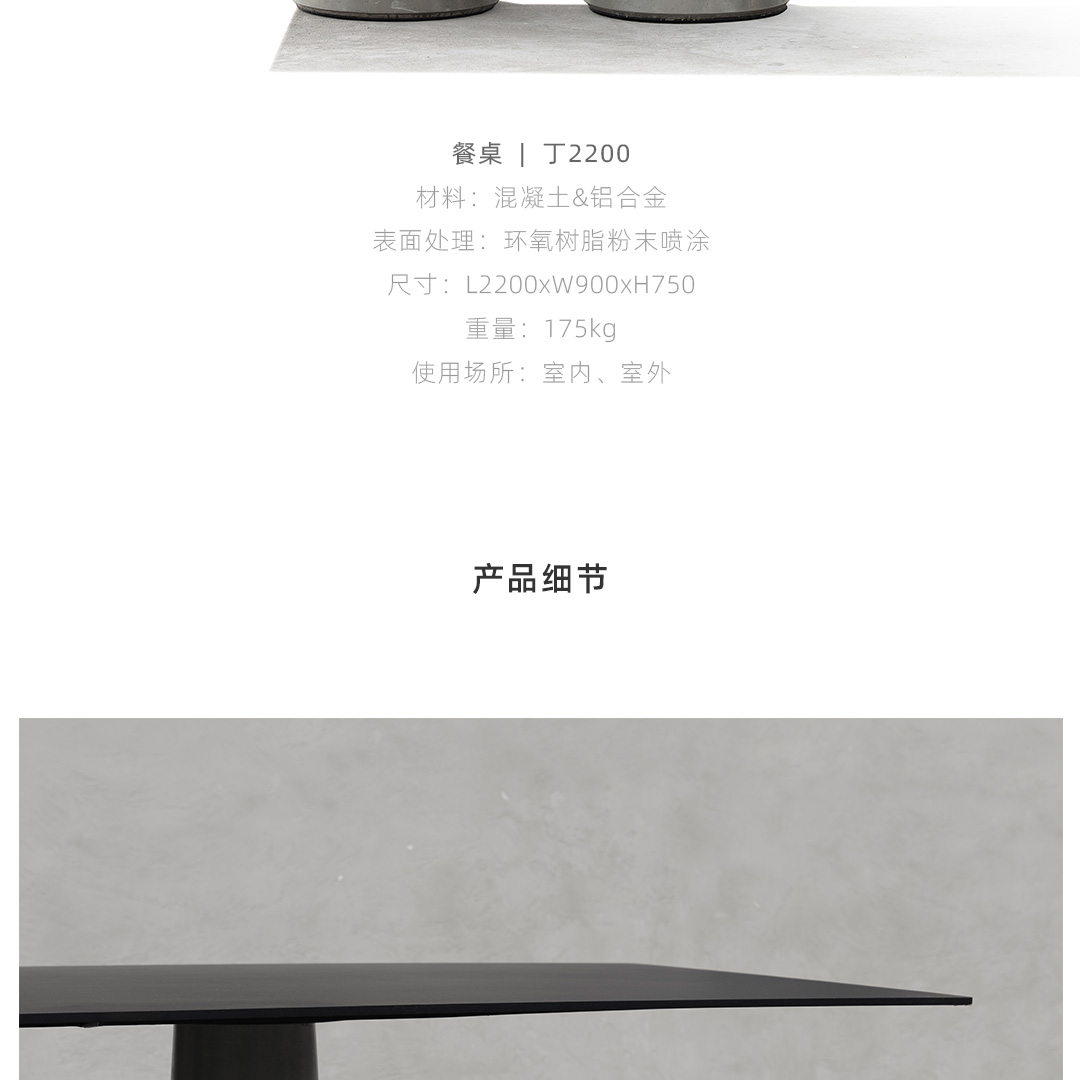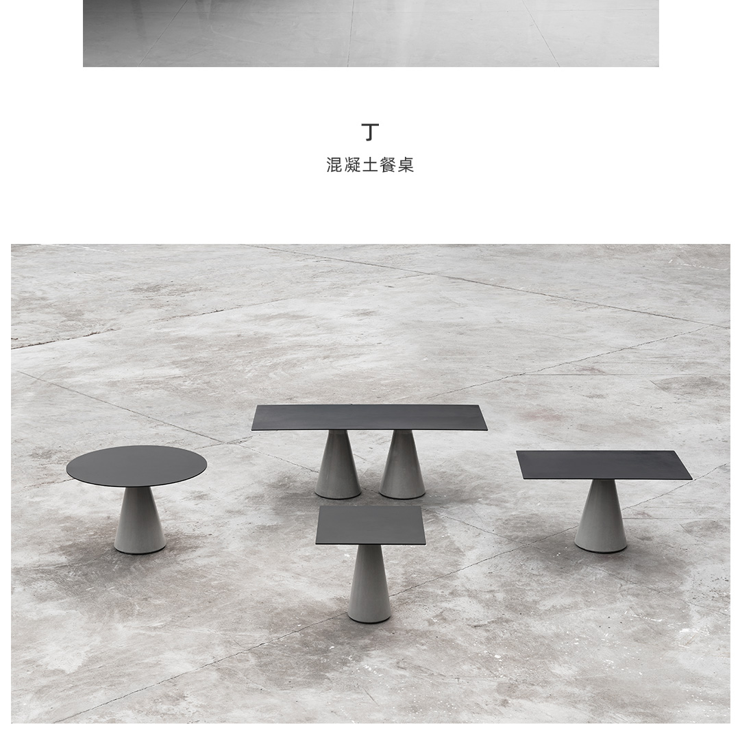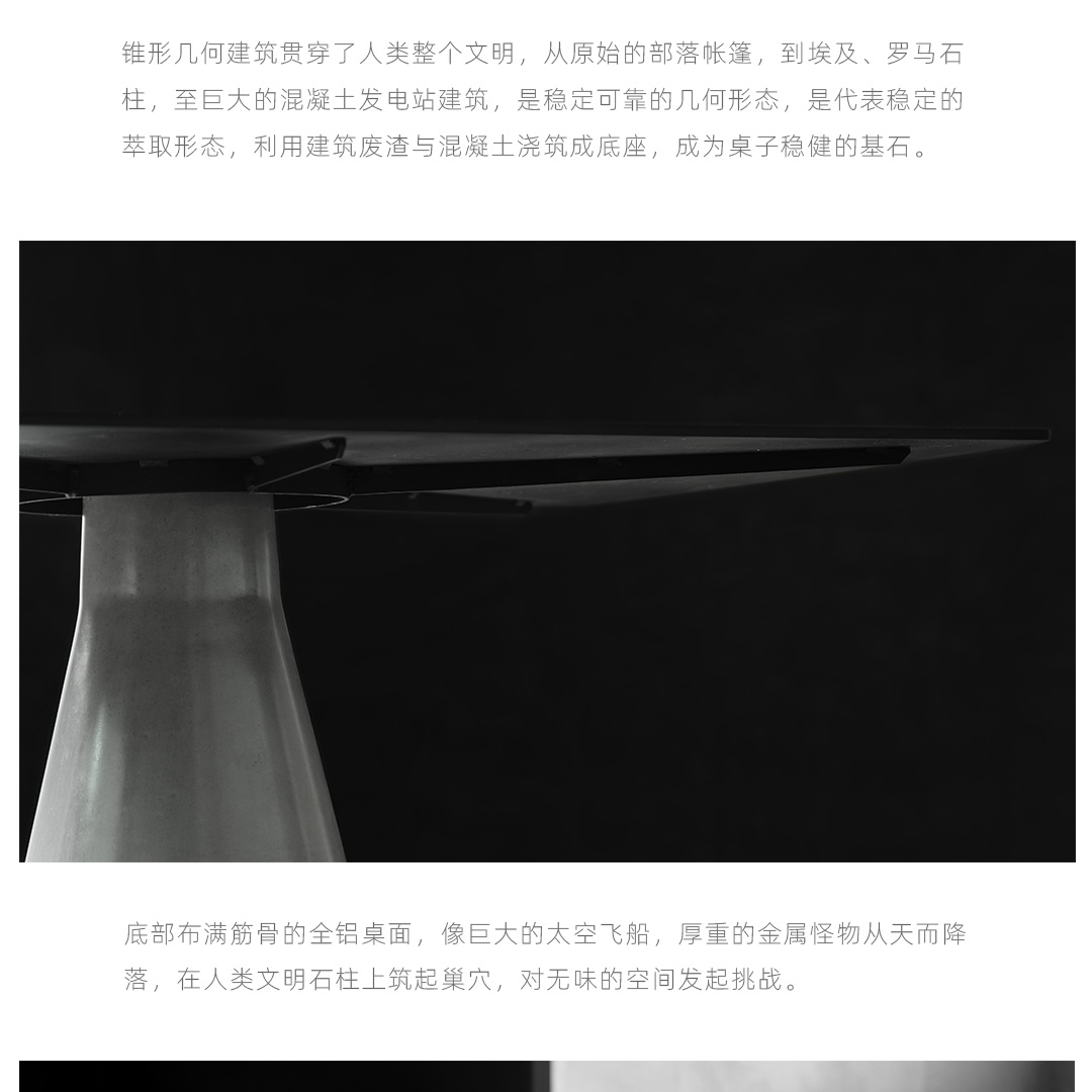 锥形几何建筑贯穿了人类整个文明,从原始的部落帐篷,到埃及、罗马石柱,至巨大的混凝土发电站建筑,是最稳定可靠的几何形态,是代表稳定的萃取形态, 利用建筑废渣与混凝土浇筑成底座,是桌子稳健的基石。 底部布满筋骨的全铝桌面,像巨大的太空飞船,厚重的金属怪物从天而降落,在人类文明石柱上筑起巢穴,对无味的空间发起挑战。