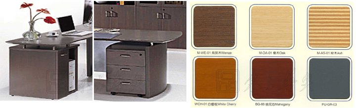 ※ 上图为大班台不同角度的展示,活动柜和落地柜在班台中的不同组合,突出每个细节做工的精细,让我们对工艺的细腻产生美的视觉冲击,右图为实木油漆色板选择。