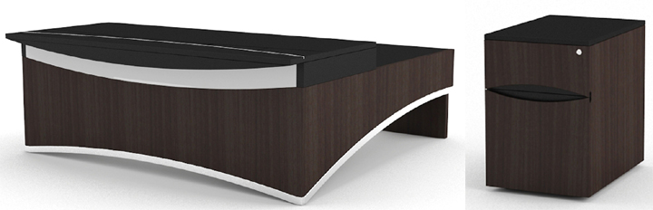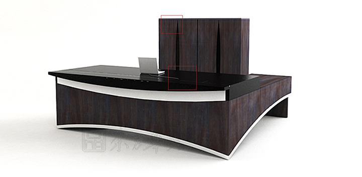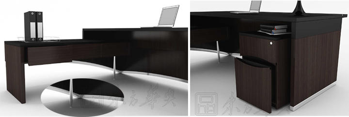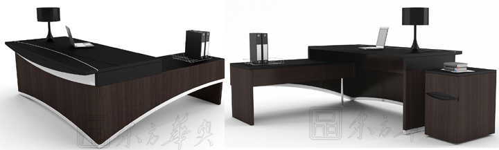※ 此款班台运用拱桥的元素置入主桌的前挡板及侧柜板; 线条流畅,有渲染力;保留桌底支架改变桌板造型,创新不同的效果。