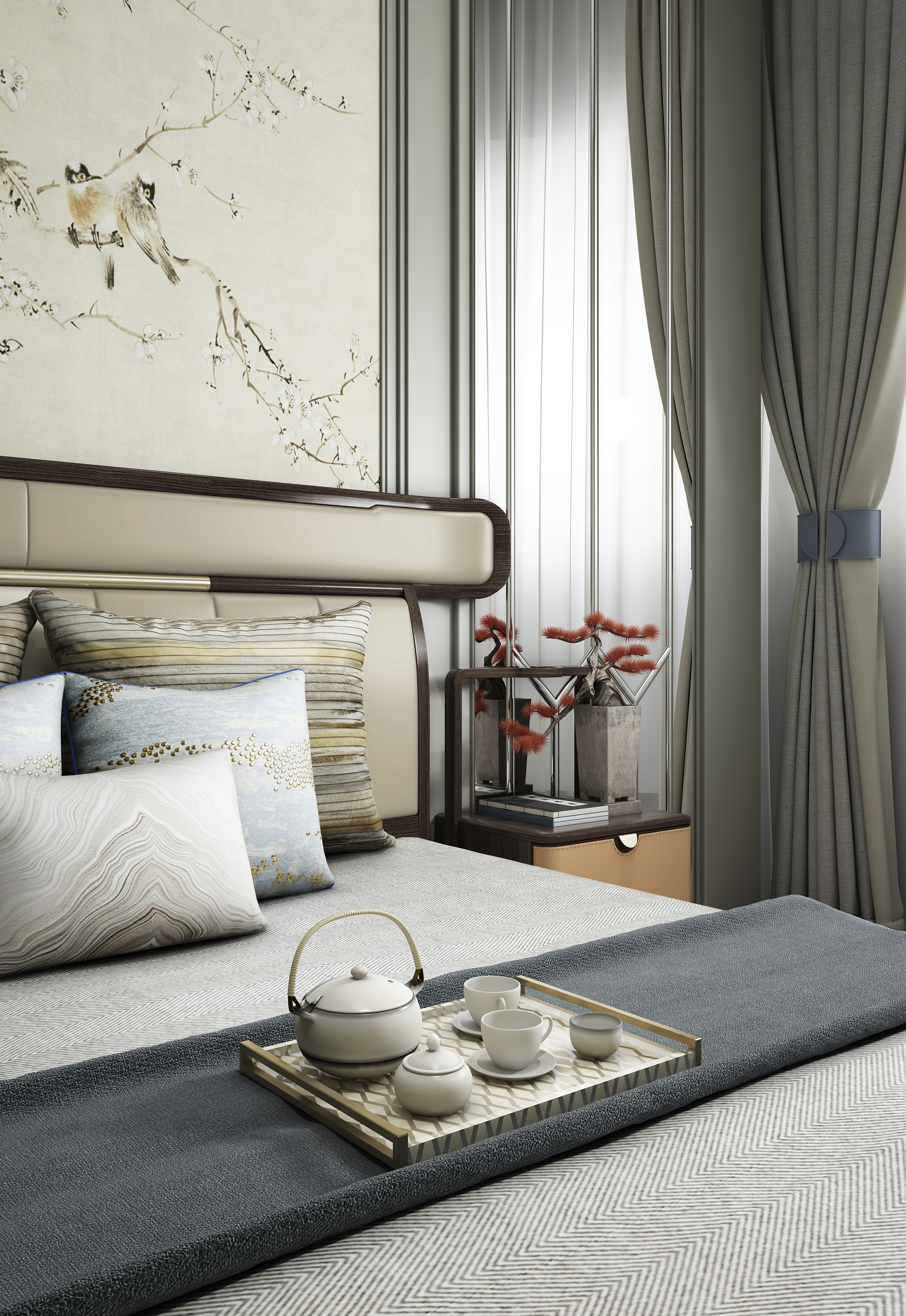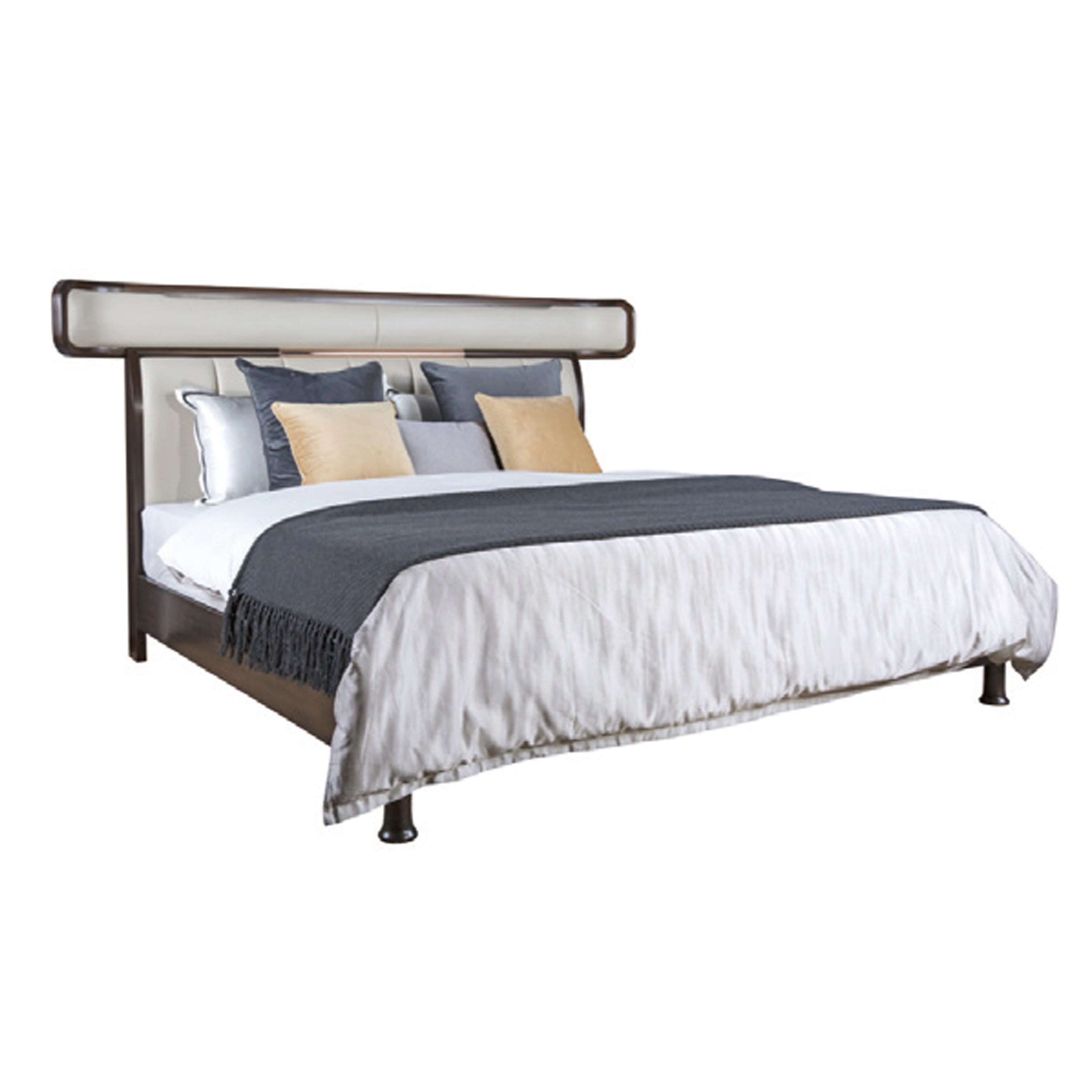 1.床高片造型源于中式官帽,出人头地,生活一帆风顺的美好寓意。同时呈环抱状,寓意夫妻关爱包容,幸福和睦。 2.床高片皮质软包设计,并饰以铜条装饰,舒适耐用,细节精致。 3.铜脚设计,赋予中式韵味的同时以防磨损。