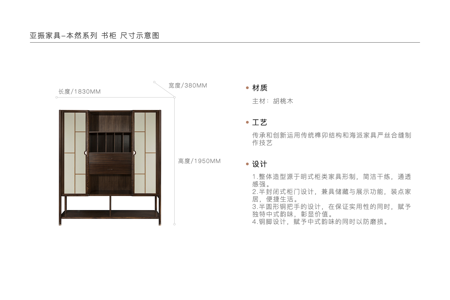 1.整体造型源于明式柜类家具形制,简洁干练,通透感强。 2.半封闭式柜门设计,兼具储藏与展示功能,装点家居,便捷生活。 3.半圆形铜把手的设计,在保证实用性的同时,赋予独特中式韵味,彰显价值。 4.铜脚设计,赋予中式韵味的同时以防磨损。