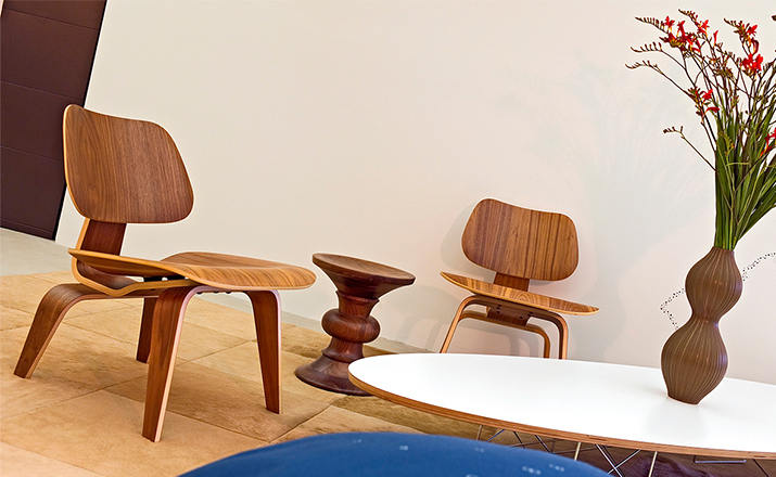 Designers Charles and Ray Eames established their long and legendary relationship with Herman Miller in 1946 with the boldly original molded plywood dining and lounge chairs.Designed to comfortably fit the body,the sculpted form of the molded plywood chairs are produced using thin sheets of lightweight veneer gently molded into curved shapes with natural rubber shock mounts to absorb movement.Since then,the chairs'aesthetic integrity, enduring charm,and comfort have earned it recognition as the best of modern design.Available in either a lounge or dining versions with chrome-plated steel or wood legs.