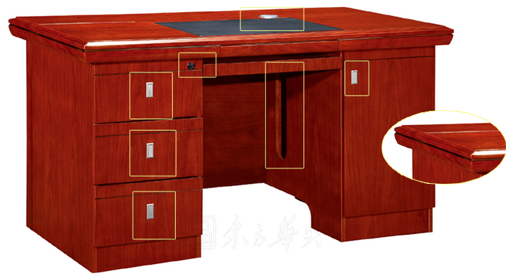 ※ 上图将此款职员台精湛的细节部位另行罗列,例如隐藏式铝合金拉手,按下拉出,实木的收纳式键盘架,镶嵌式梯形皮垫,台面双色分线条,跑道型过线孔,功能齐全!