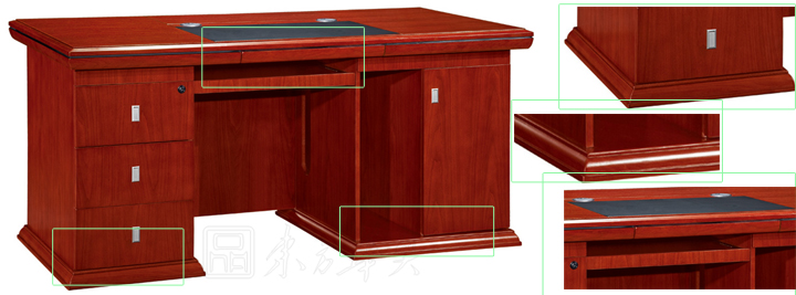 ※ 上图将此款职员台精湛的细节部位另行罗列,例如隐藏式铝合金拉手,按下拉出,实木的收纳式键盘架,镶嵌式梯形皮垫,台面双色分线条,跑道型过线孔,弧度收边台面脚和踢脚板脚,稳重厚实!