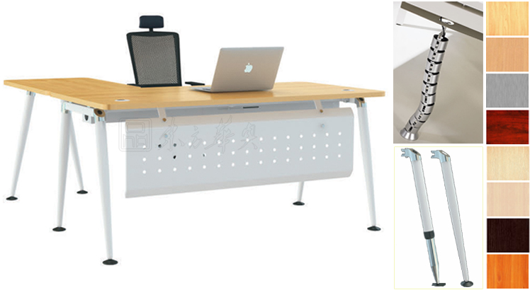 ※ 上图是办公桌正面展示图,椅脚可分为固定和可升降调节,配置时尚脚垫,防滑防刮伤,桌面配置蛇形管,可以防止线路搭乱现象,时尚现代表现的淋漓尽致,搭配喷塑白色,清爽,简洁!