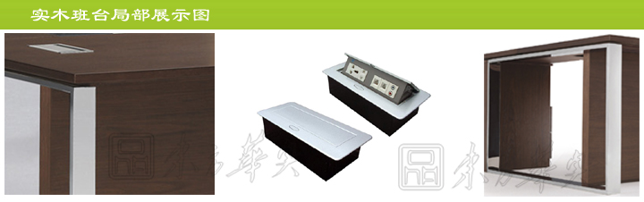 ※ 上图为口字形脚架展示图;电动线盒,插电点击自动翻转,内部配置可以根据办公需要选配和定做,万能插口,网络插口,麦克插口,音频插口;实木挡板。