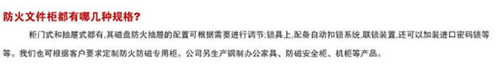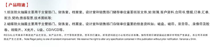 1,纸张防火抽屉主要用于主管部门,财务室、档案室、设计室和销售部门储存单位重要纸张文件,如:帐簿、客户资料、合同书、借据、订单、汇单、配方、契约、债券股票、技术图纸等;