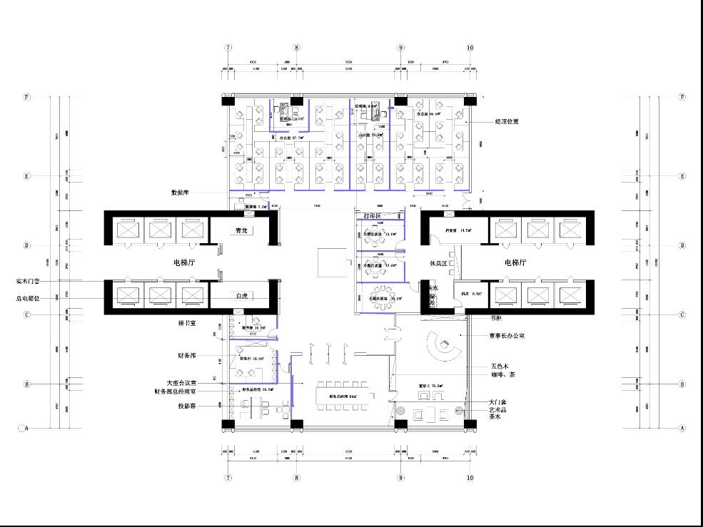 | 密拼实木门的设计是本案的一大亮点,它在以后的方案设计中起到一定的主导作用,会议室主讲台隔墙,中间是浅蓝烤漆玻用以书写,笔托设计的是镶嵌式的,是为了防止人员碰撞。两边是黑色KM板加以装饰,使得整面隔墙朴素,内敛,大气! |