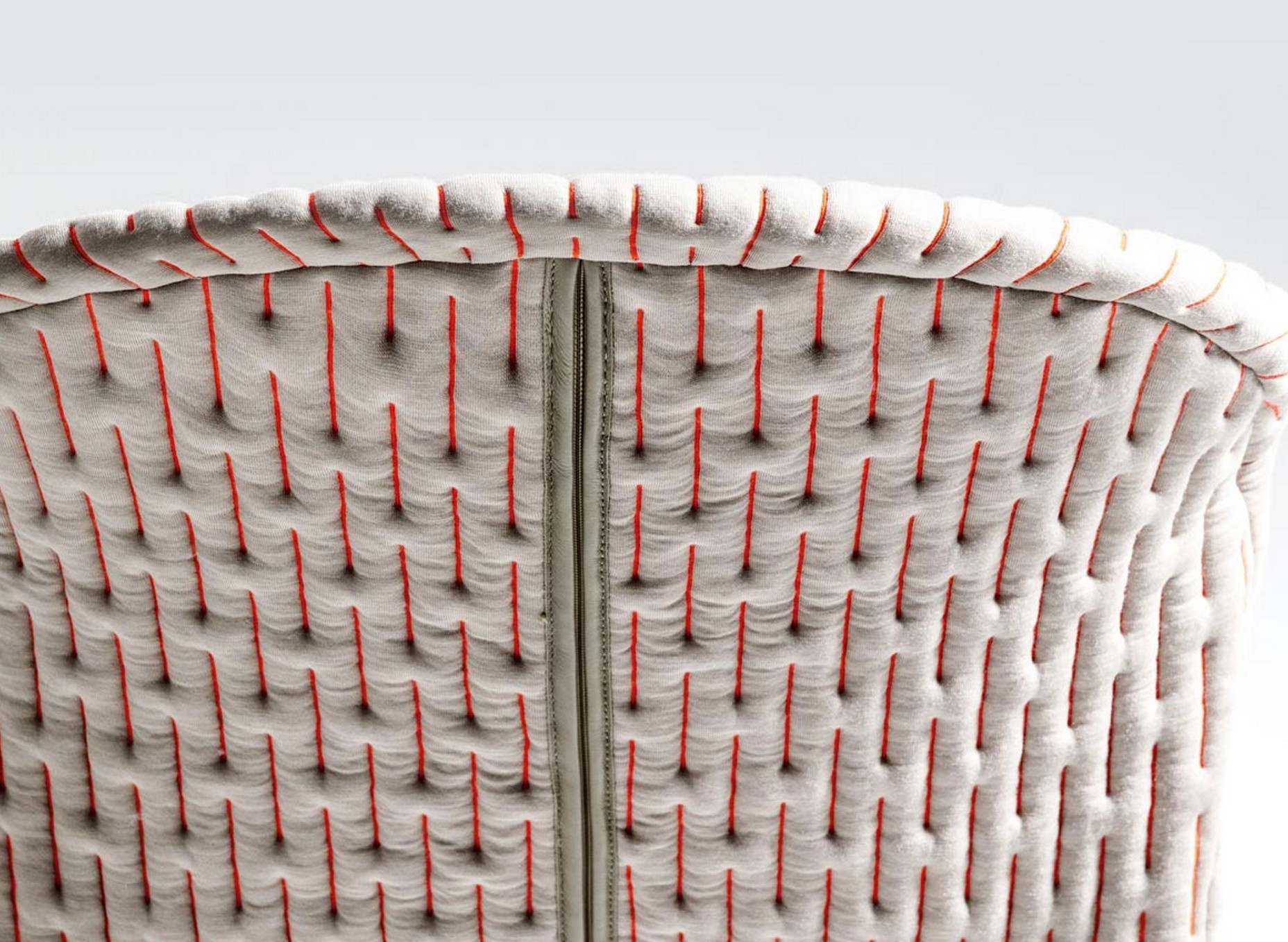 伪装成休闲椅的扶手椅,用他们的外表来控制空间。这主意很简单,用一件有衬垫的大衣盖住金属框架然后把它变成别的东西。一种非常直立的姿势,扶手的形状让人联想到双排扣外套的翻领,而这种相似之处就在中央扣扣上。室内装潢变成了衣服,可以在不过度的情况下,将赤裸的身体转变成一种追求自身内在同一性的物体。