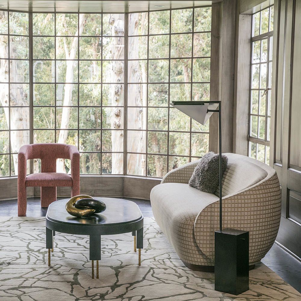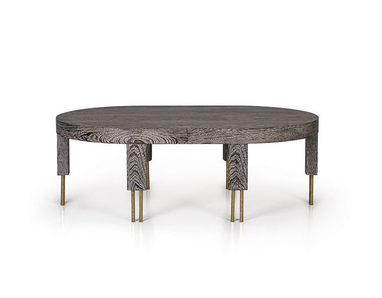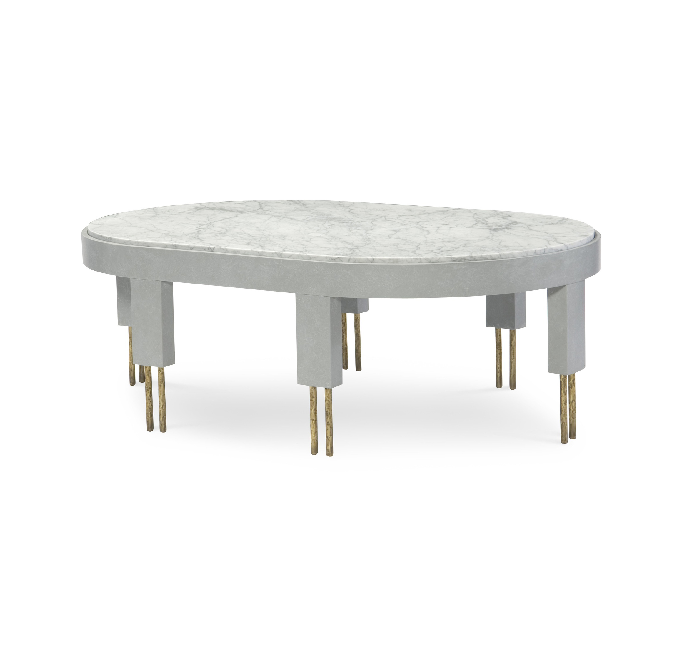 赛马场形状的大理石台面与这款低矮的咖啡桌相得益彰。 黄铜的Melange腿具有手工纹理,在整个系列中都很突出,为底座增添了一丝精致感。