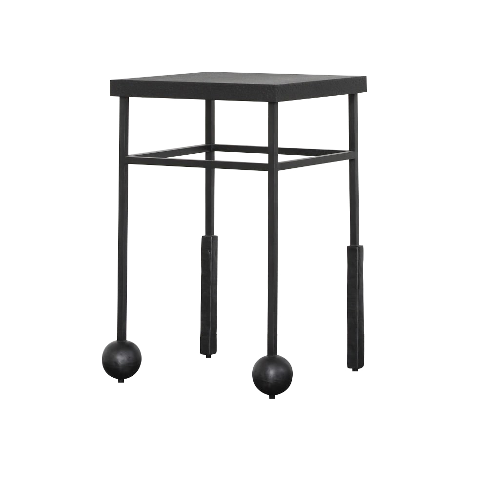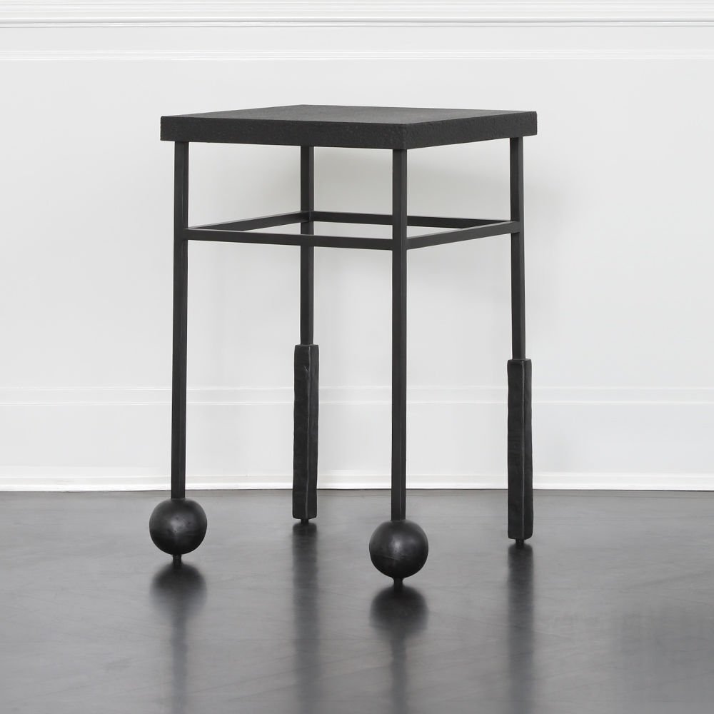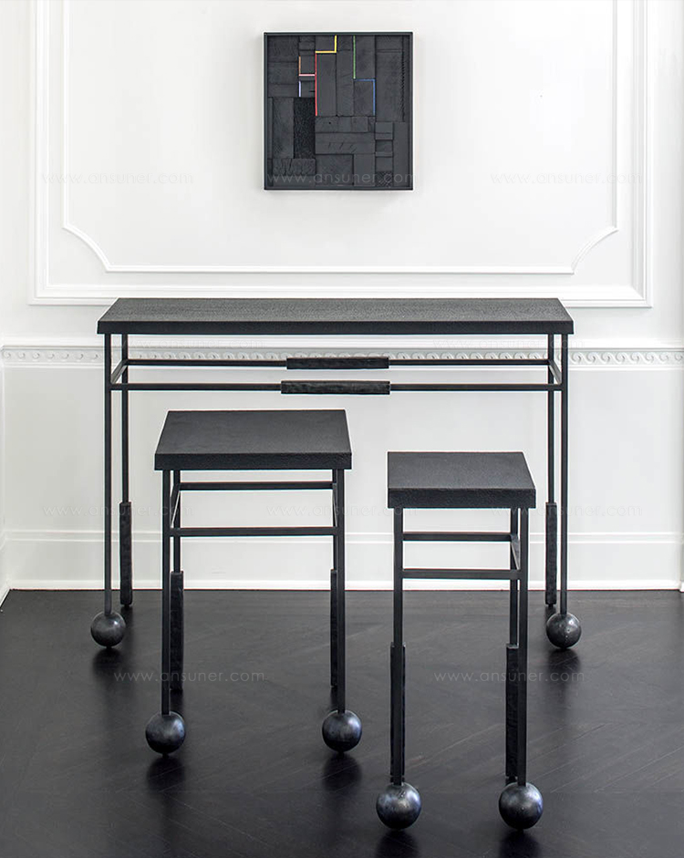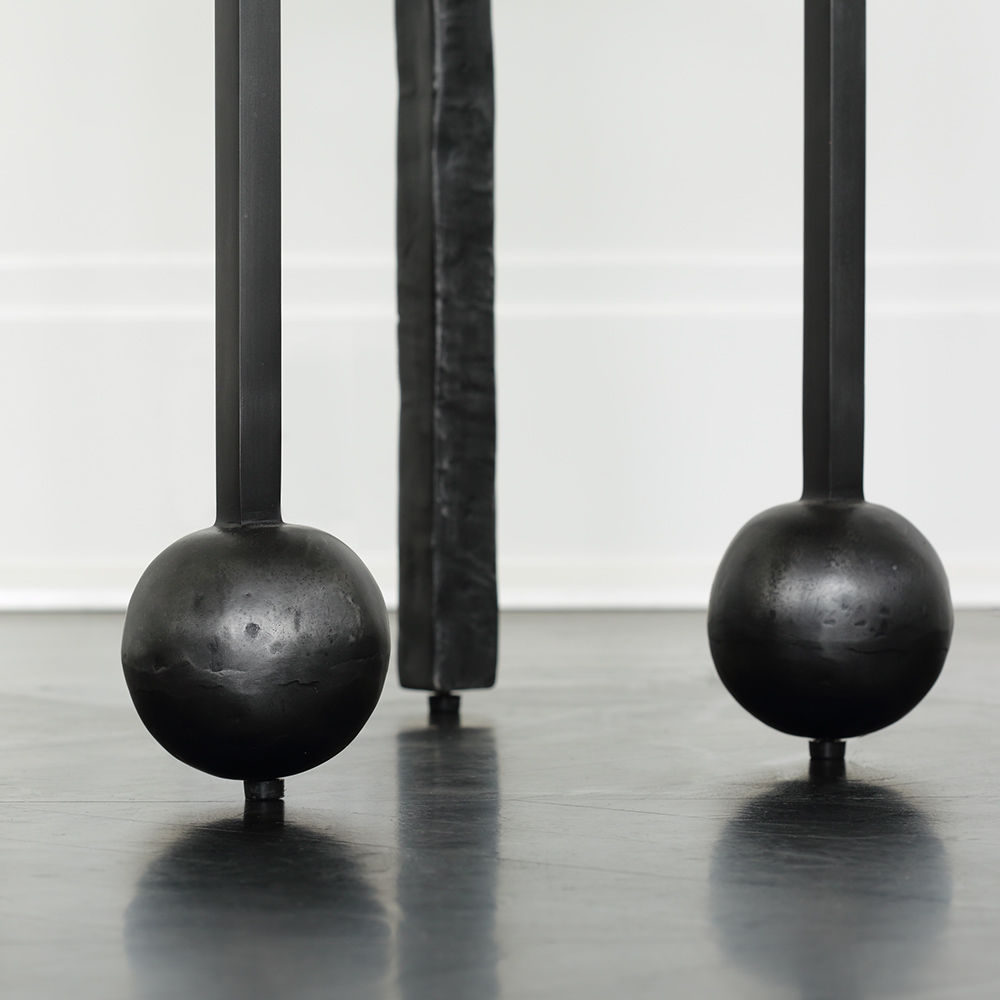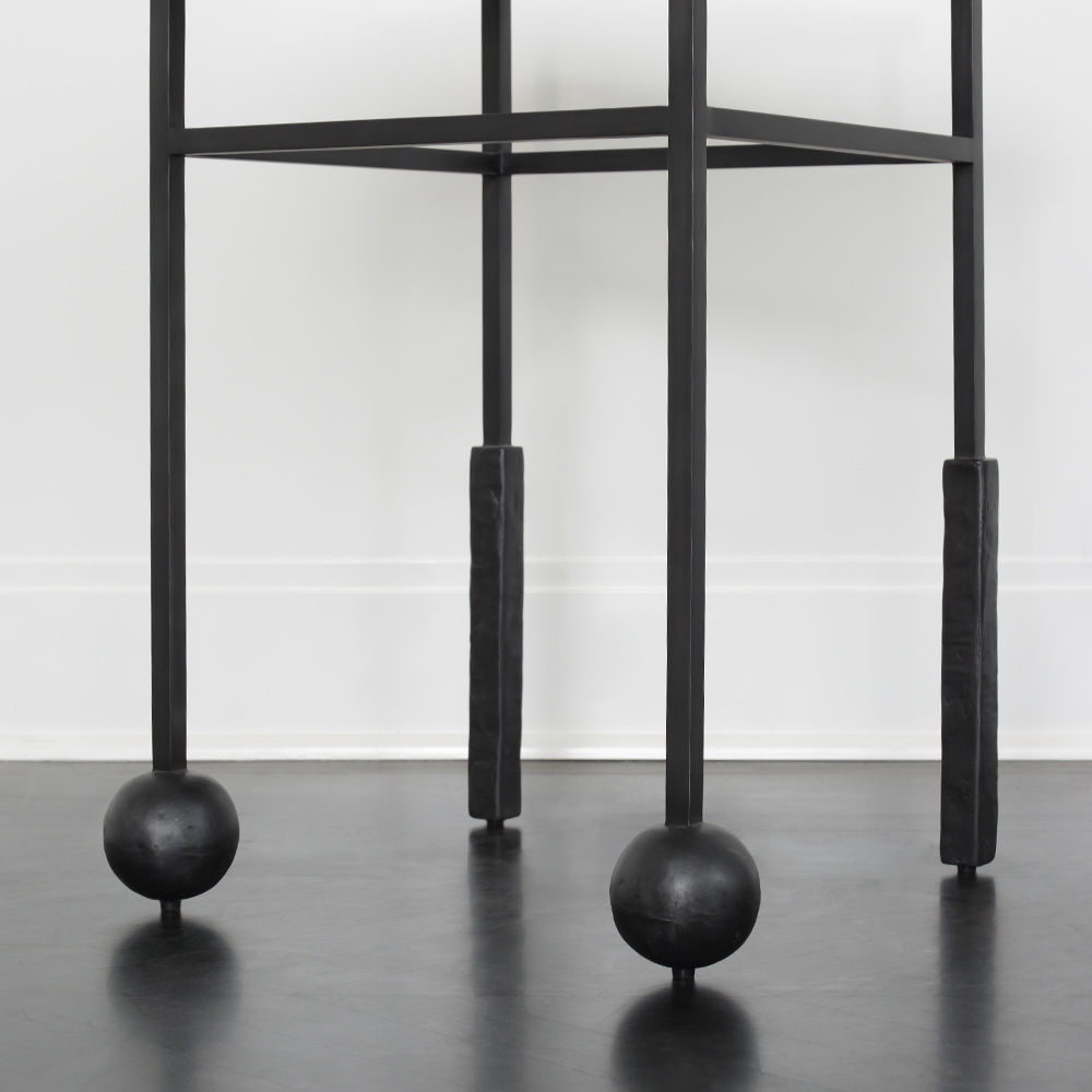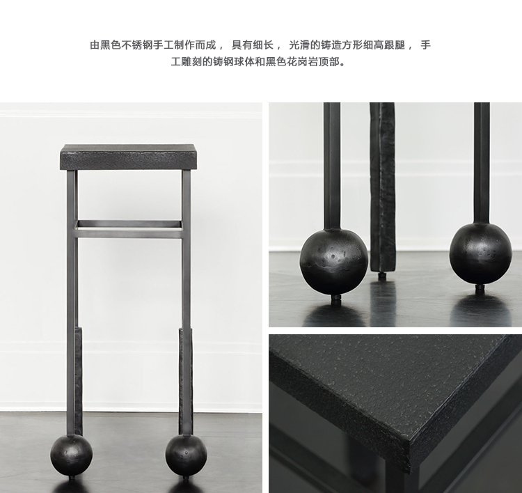 雕刻的尼姆饮料桌是由黑色不锈钢手工制作而成,具有细长,光滑的铸造方形细高跟腿,手工雕刻的铸钢球体和黑色花岗岩顶部。