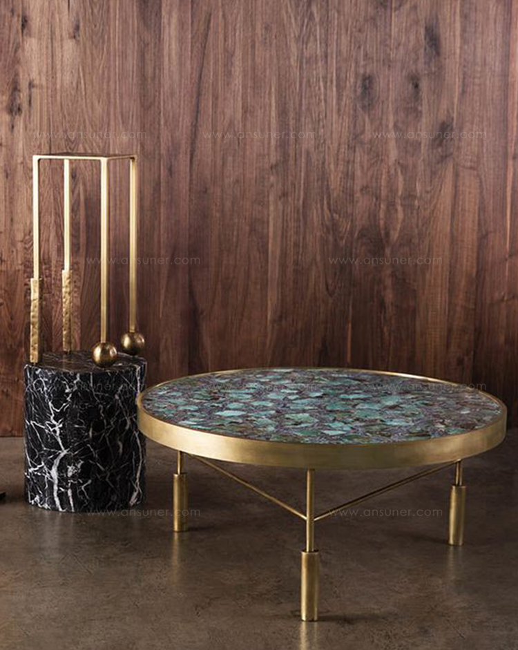 Nimes Petite Cocktail Table(尼姆小巧鸡尾酒桌)采用铝合金手工砂铸造,然后采用光泽抛光黄铜饰面,赋予作品模仿的雕塑质感和坚实的手感。 桌子本身由精致光滑的方形细高跟腿组成,配有手工雕刻的铸造球体。