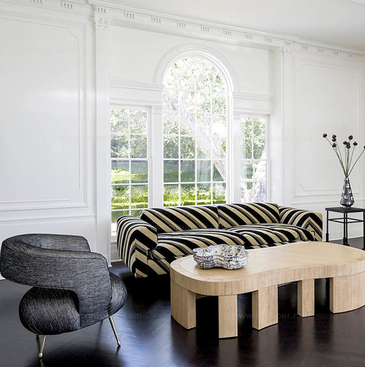 大胆的无定形罗德咖啡桌采用整体式黑檀木和拉丝橡木框架,与实心四分之一木质顶部和整体式腿部的光滑表面形成鲜明对比。
