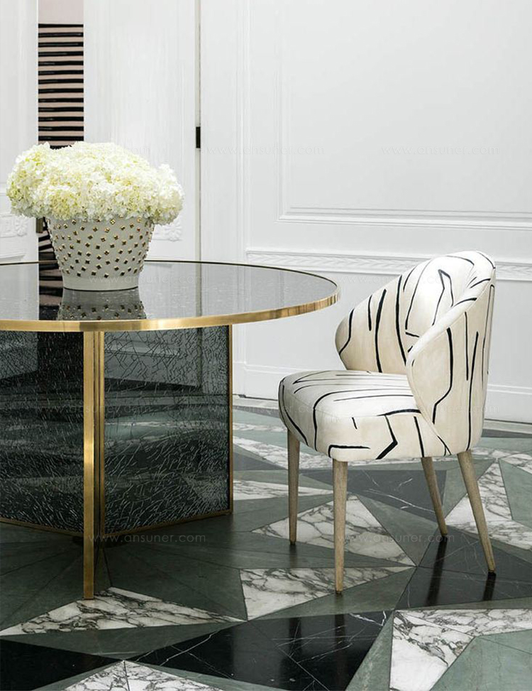 这款引人注目的现代餐桌拥有精美的纹理,融合了原始和精致的元素。 每块钢化玻璃都是手工破碎的,创造了材料的并置与优雅的古董黄铜封边条。