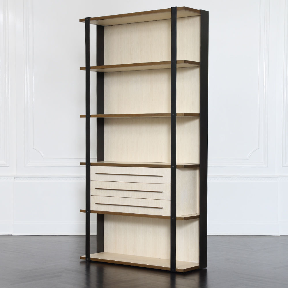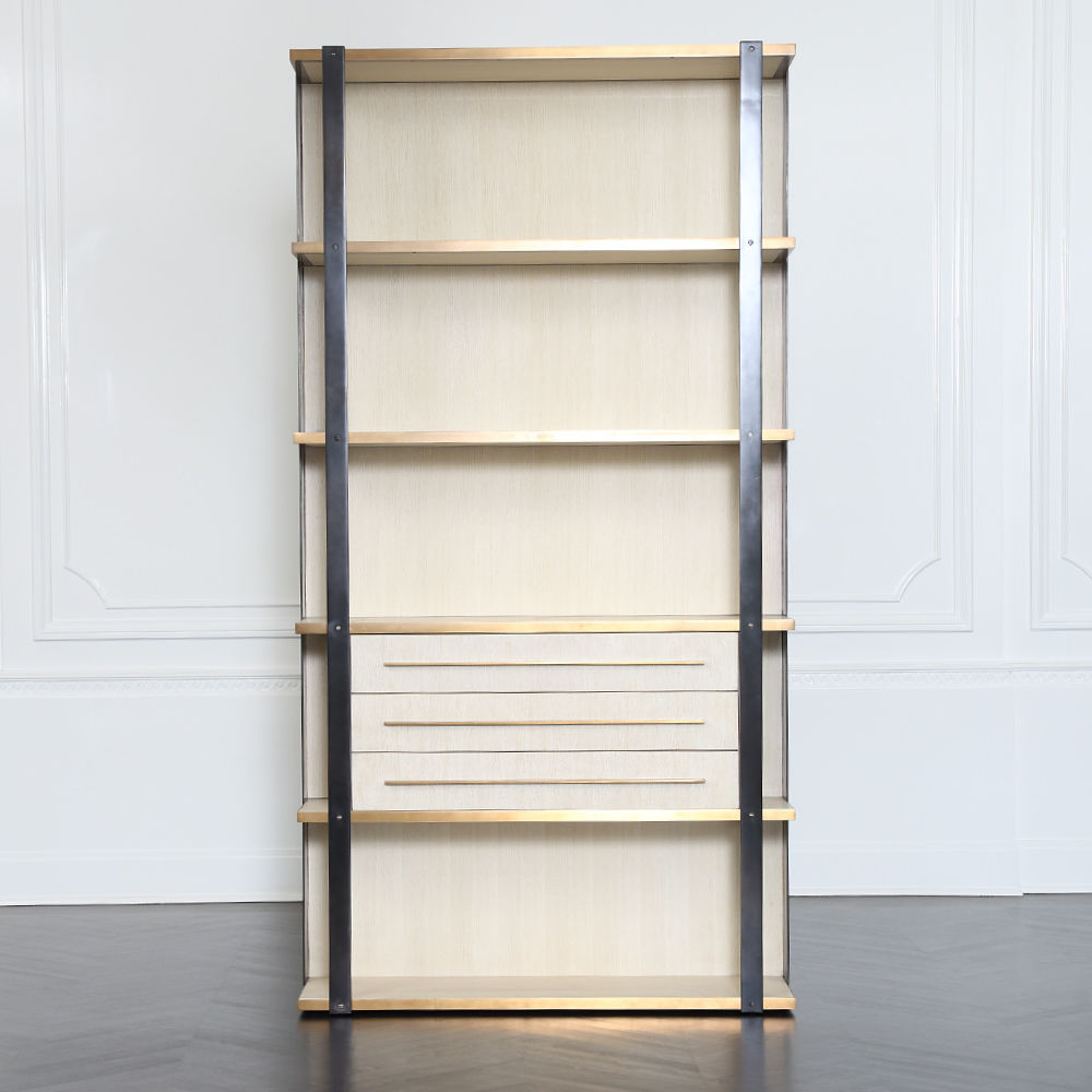 凭借Kelly对混合金属和材料并列的喜爱,富兰克林橱柜由黑色钢架,漂白的胡桃木制成,架子上饰有抛光青铜。 橱柜配有三个抽屉,四分之一英寸铣削青铜拉手,外观大胆,精致,现代。