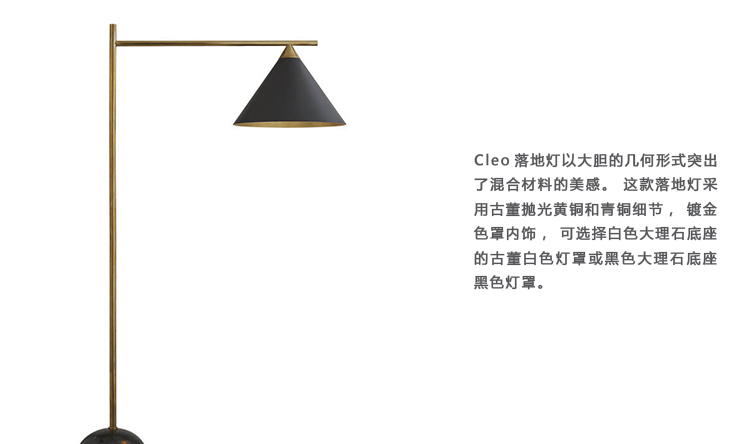 Cleo落地灯以大胆的几何形式突出了混合材料的美感。 这款落地灯采用古董抛光黄铜和青铜细节,镀金色罩内饰,可选择白色大理石底座的古董白色灯罩或黑色大理石底座黑色灯罩。