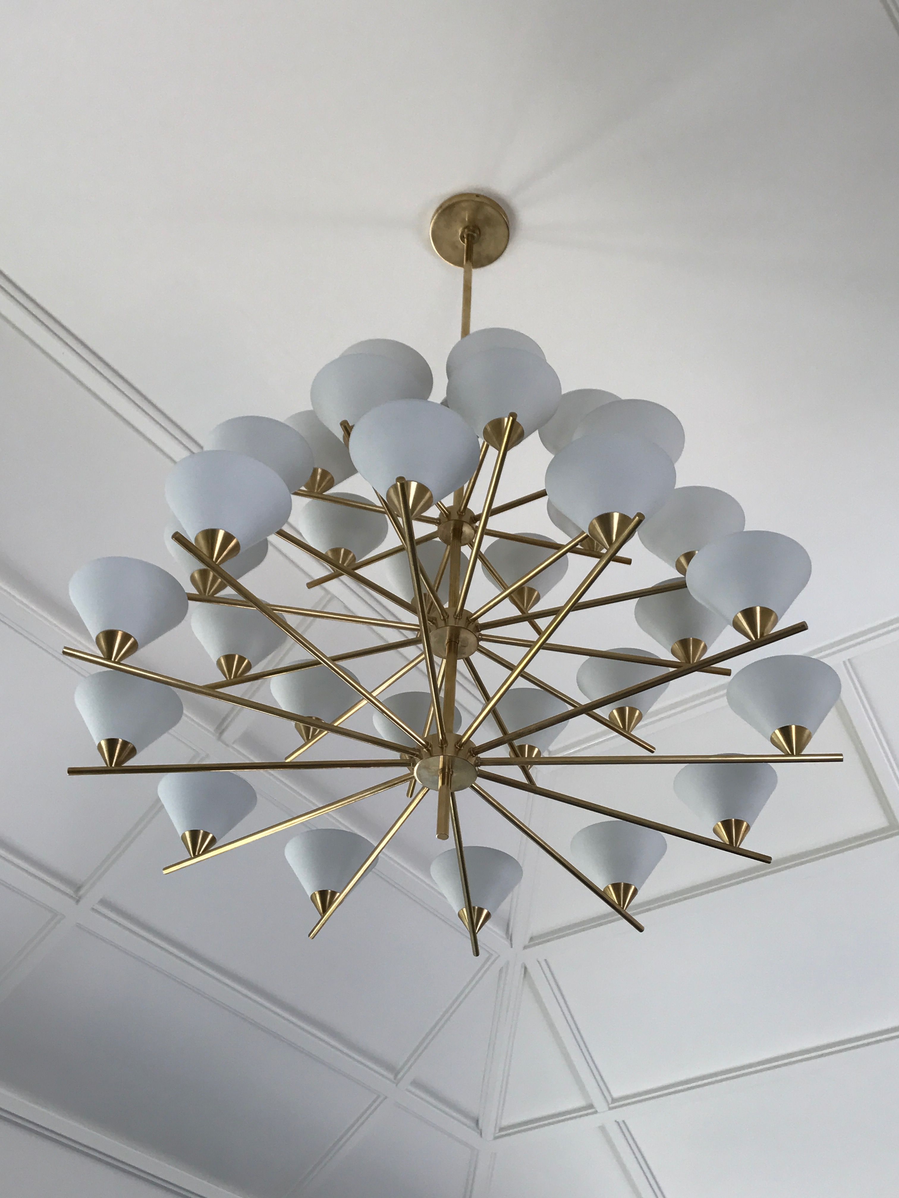 Cleo枝形吊灯以大胆的几何形式突出了混合物质的美感。 这款古董抛光黄铜吊灯采用镀金色罩内饰,可选择白色大理石球形的古色古香色调或黑色大理石球形黑色色调。