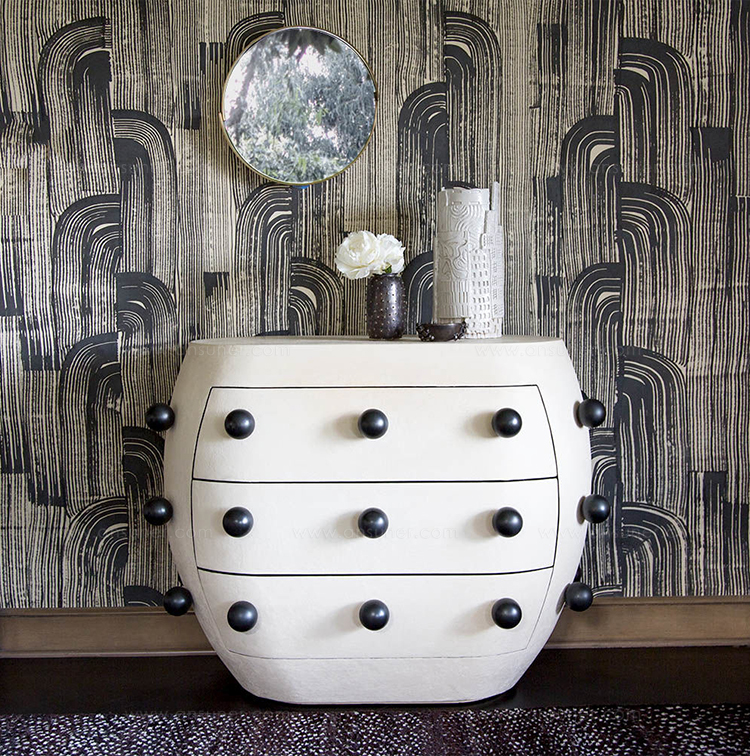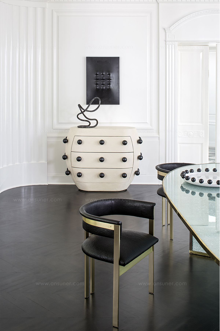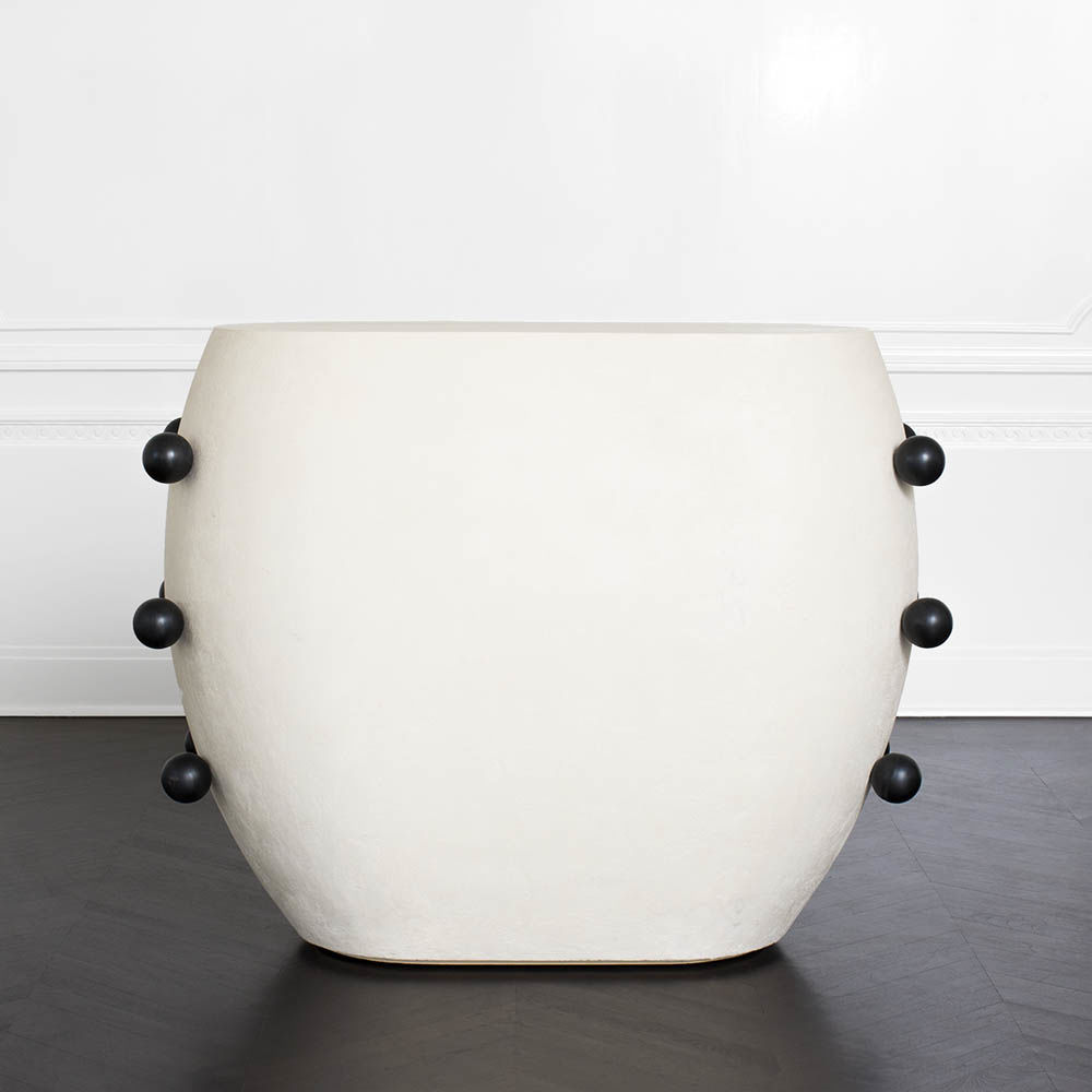 Pop柜子从凯利对对比材料的热爱中汲取灵感,并突破了形式和功能的界限。 这个三抽屉柜子的外部覆盖着一个独特的象牙手工抹平的石膏,并点缀着黑色的不锈钢球体。 这款对比色的黑檀木橡木,使其成为优雅存储的高功能选择。