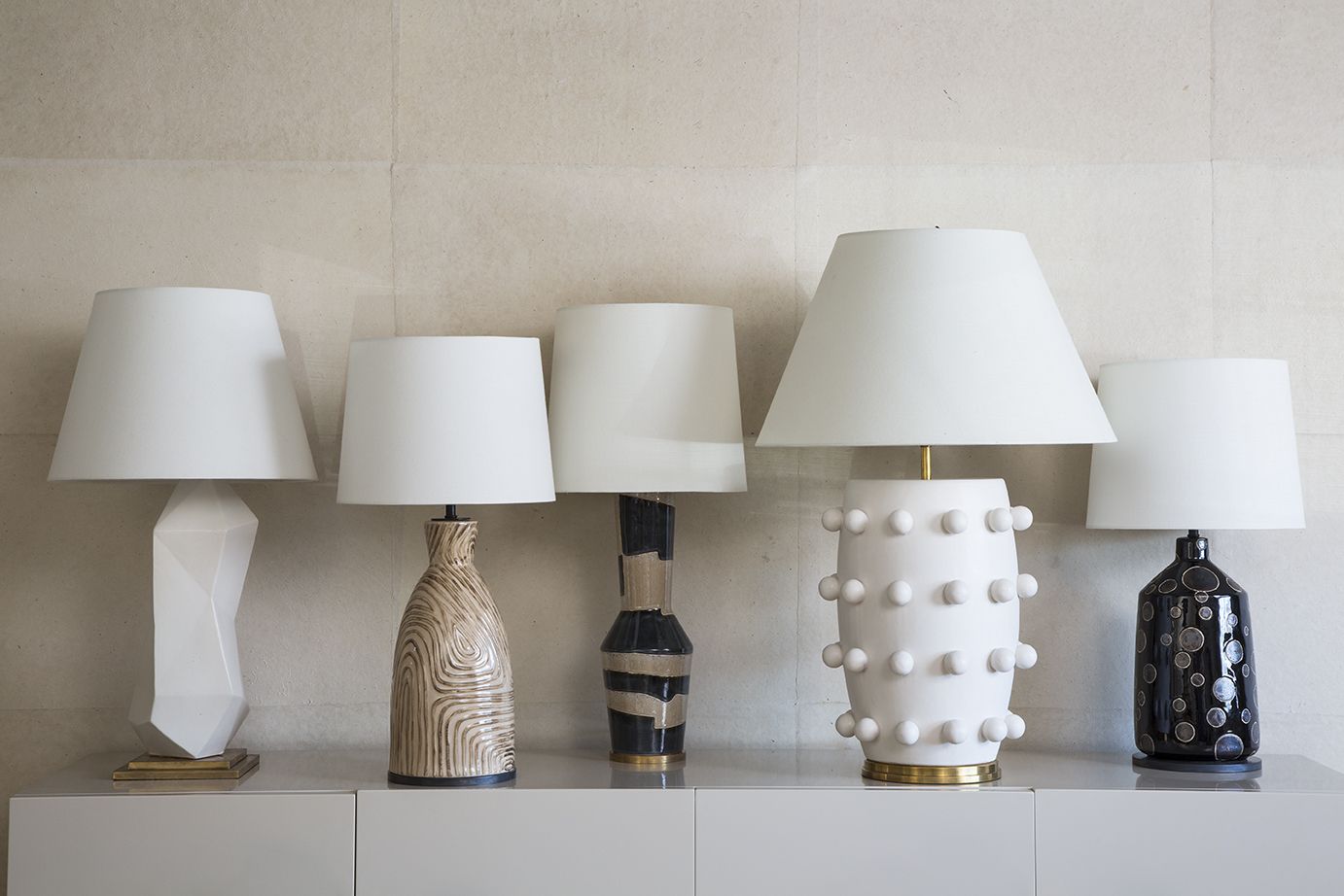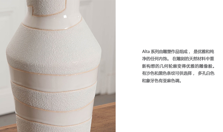 Alta系列由雕塑作品组成,是优雅和纯净的任何内饰。 在雕刻的天然材料中重新构想的几何轮廓变得优雅的雕像般。 有沙色和黑色条纹可供选择,多孔白色和象牙色有亚麻灯罩。