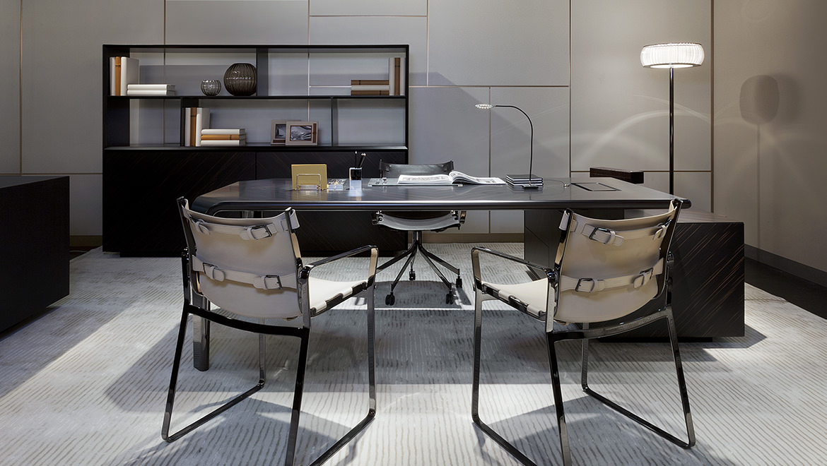 Ebony Macassar with diamond drawing matt finishing. Spacer-joint undertop in glossy brushed wood coordinated with the leather top, matt or polished
