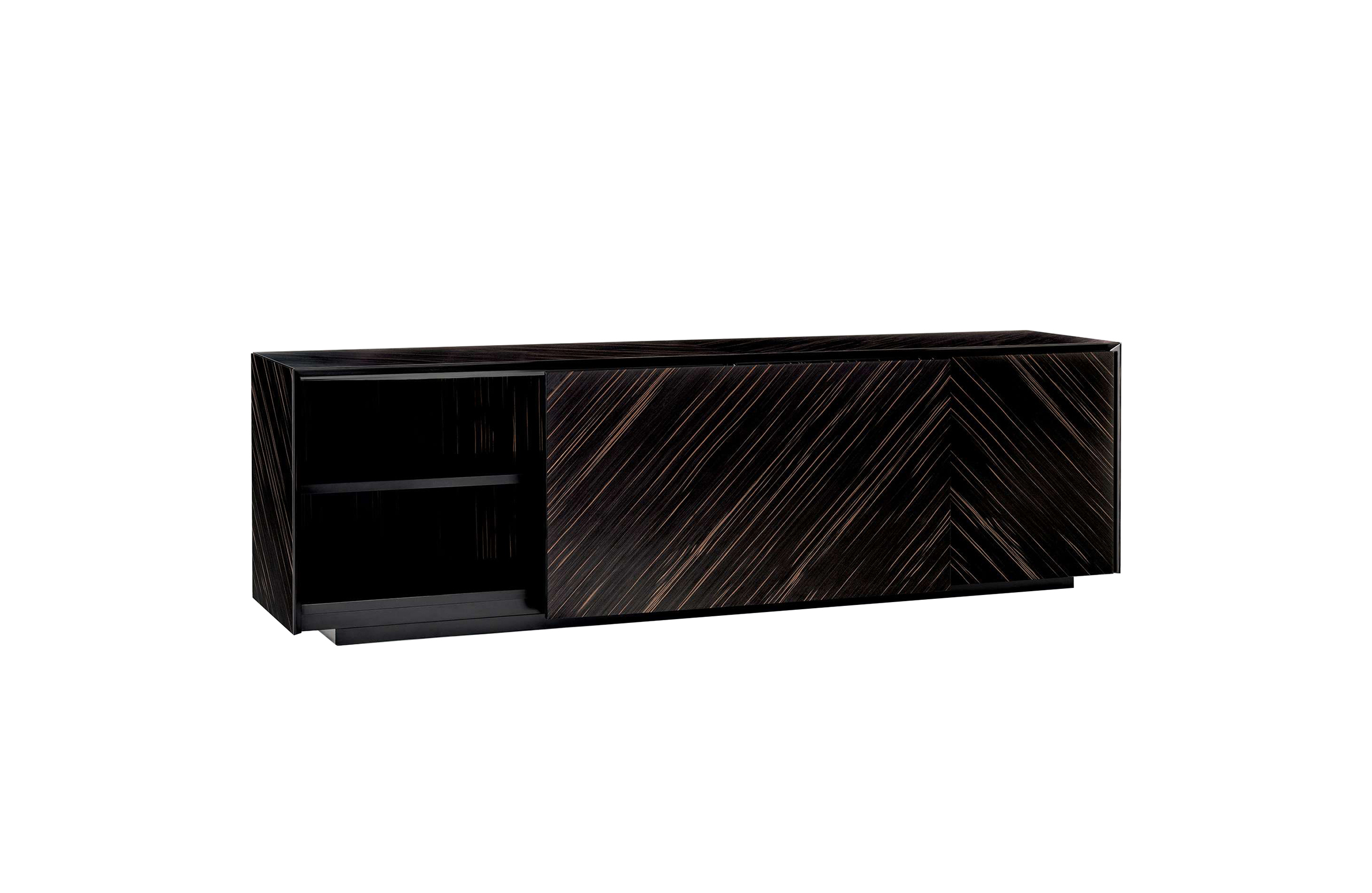 SHUTTERS Coplanar opening system, wood covered in Vermont leather or veneered Ebony Macassar with matt finishing