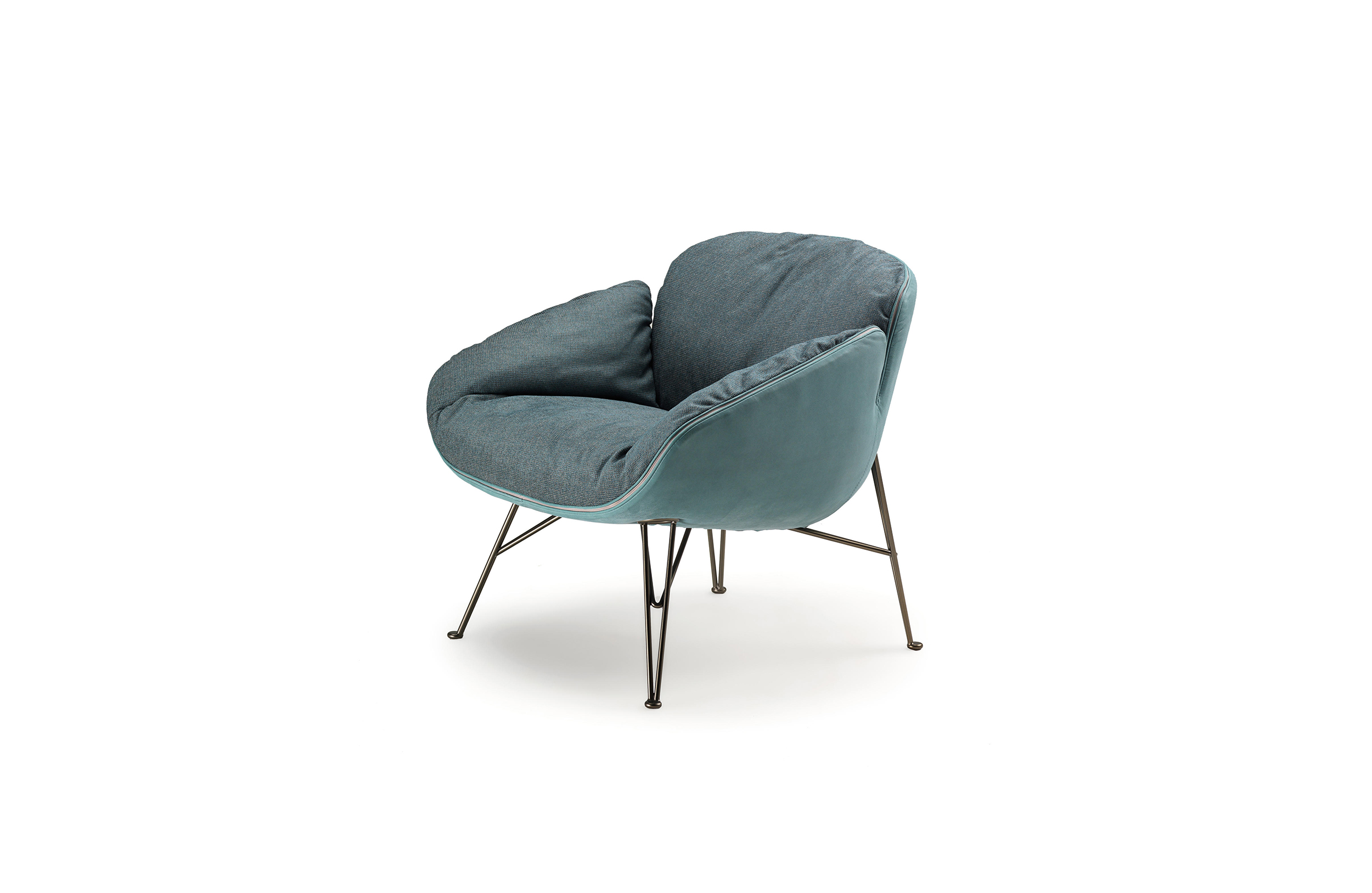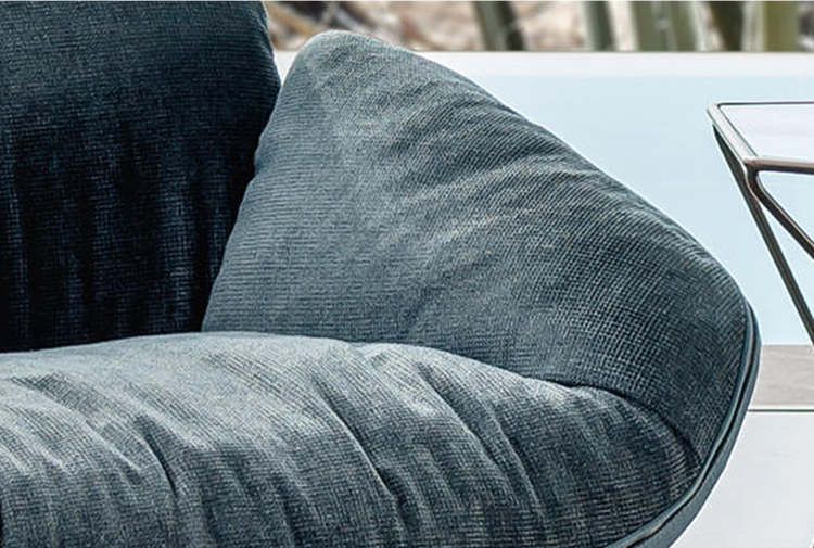 在扶手椅朱诺的背部和手臂柔软的衬垫与薄结构的严谨性形成鲜明对比。一条细长的线连接着内部和外部的部分。拉链在扶手周边区域运行,在各个部分之间创建了一个令人着迷的连接。框架由四个金属脚组成,它们构成了光的三维形态。