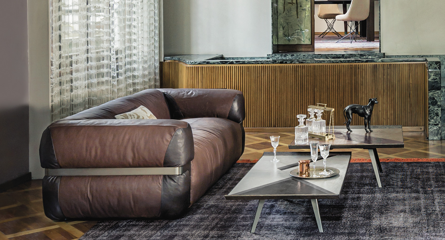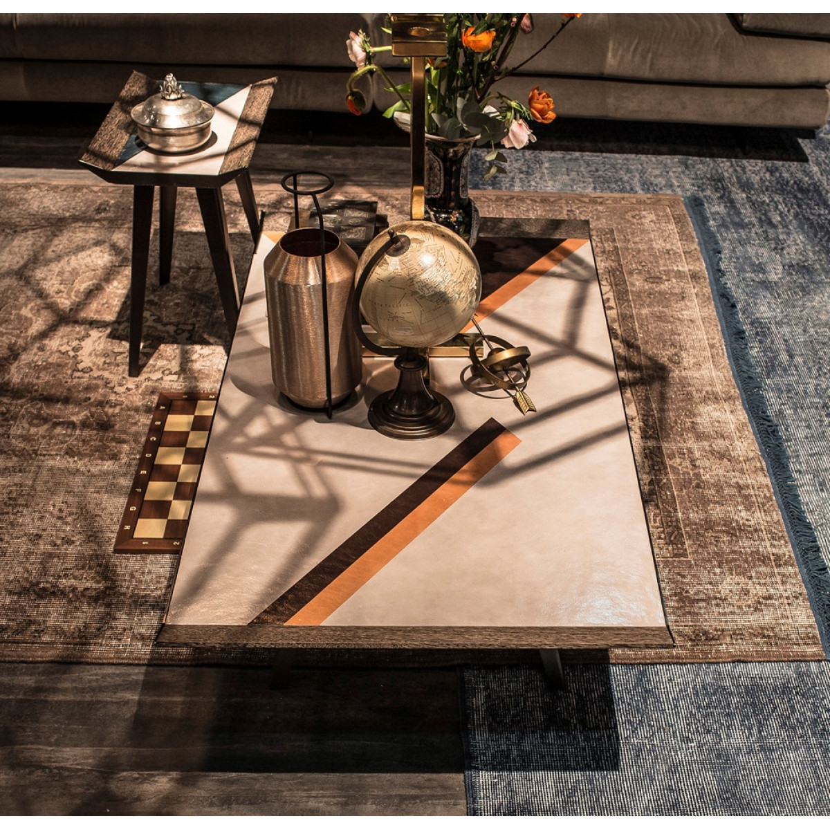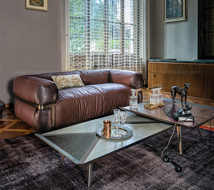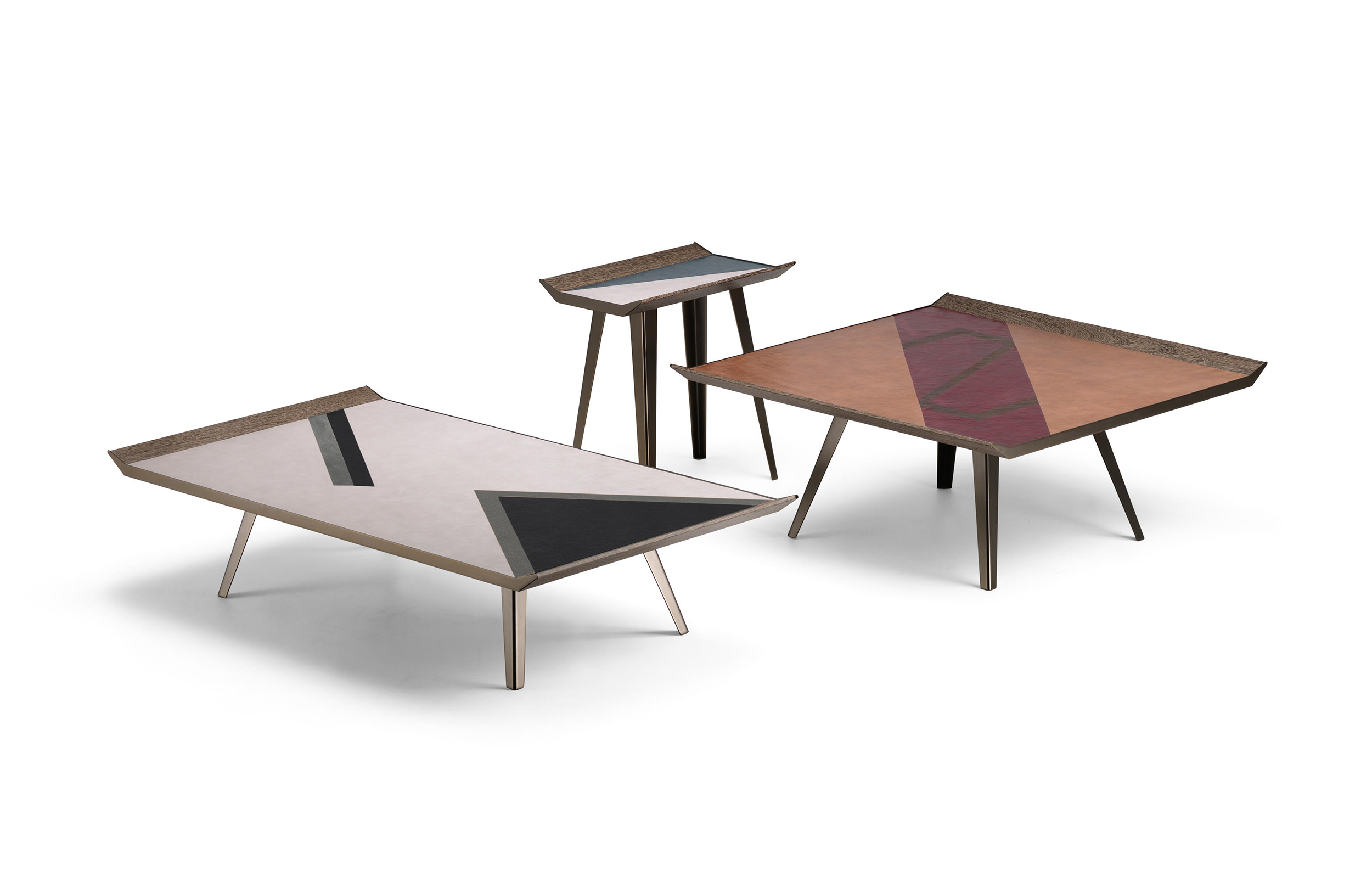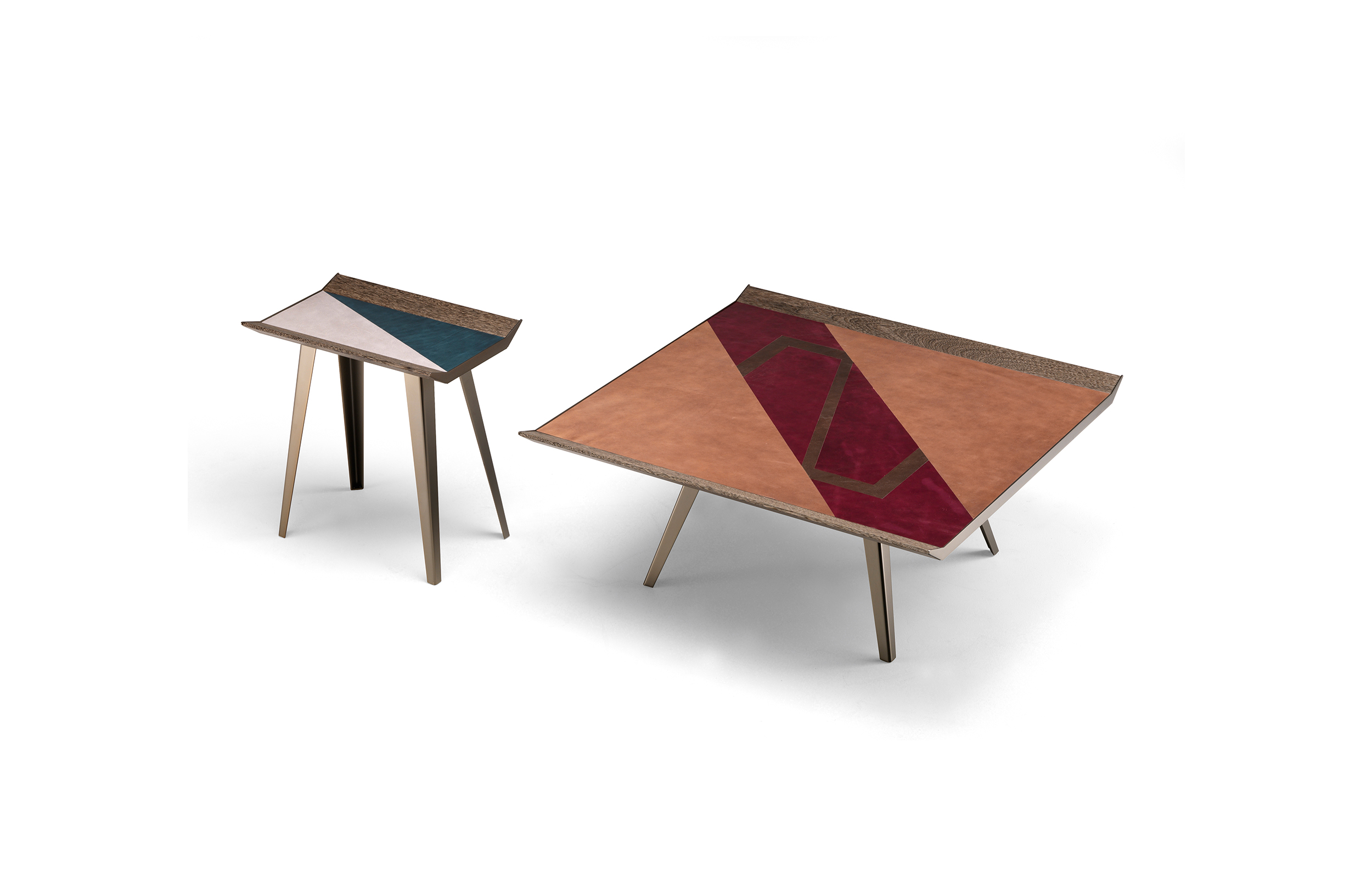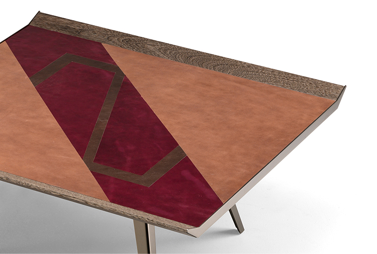 由Gino Carollo设计的的太空入侵者是矩形的系列矮桌子。它们的独特之处在于上面部分覆盖了植物鞣制的皮革,这让人想起了非洲的几何图案,混合了自然和强烈的色彩。