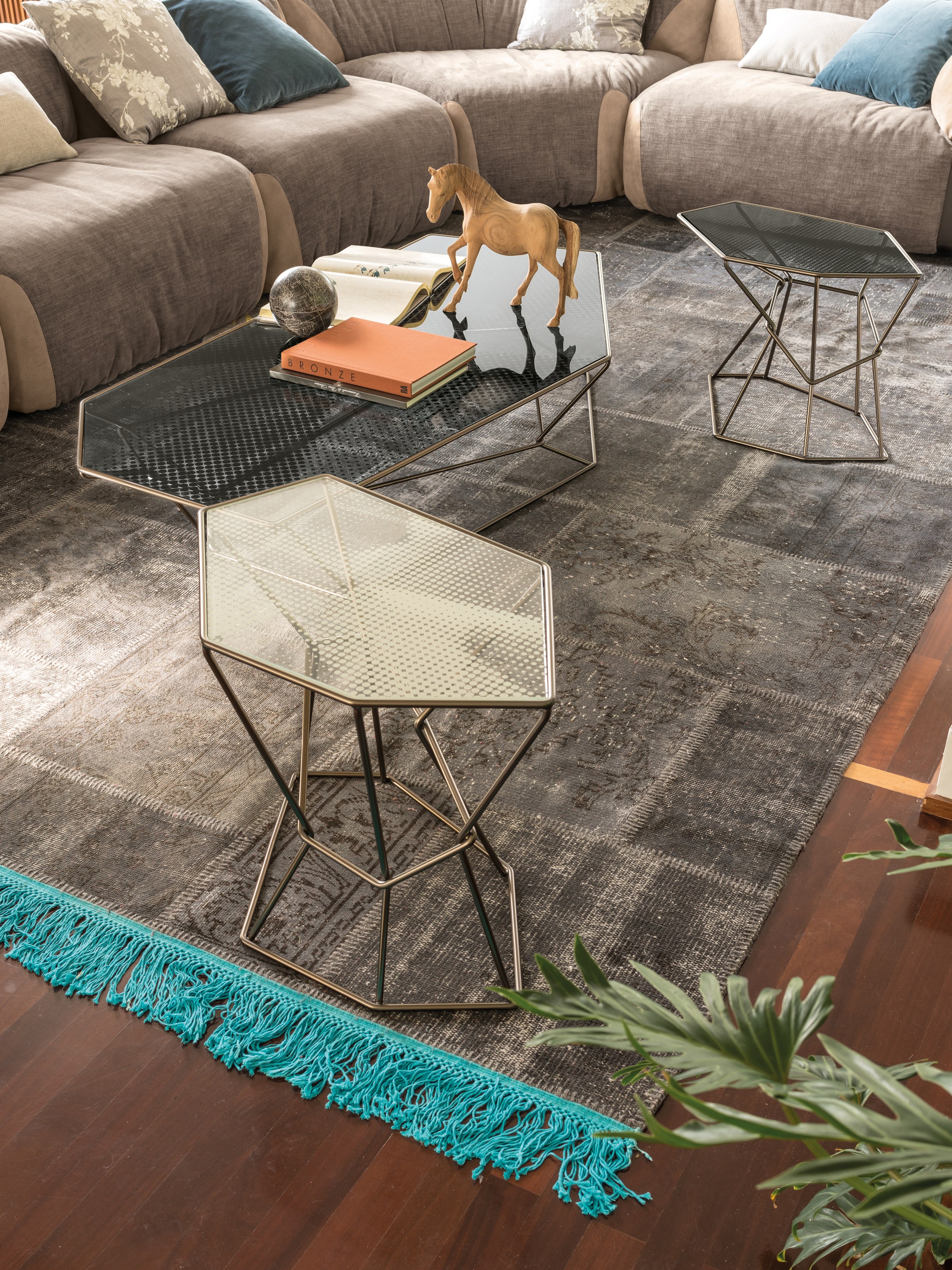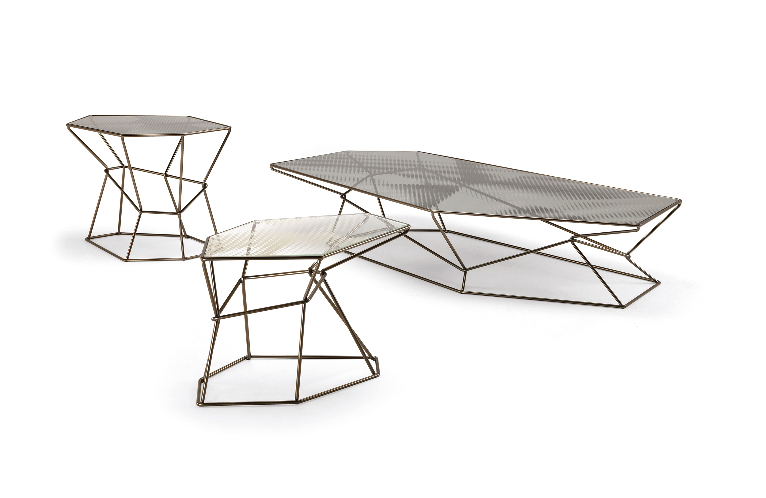 马洛·利帕利尼(Mauro Lipparini)的这款“倒车矮桌”(Rebus low tables)有金属结构,云母棕色的染色或镀锌的钛,以及一层金属丝的玻璃。结构和顶部都有不规则的形状,形成一种不寻常的交织。