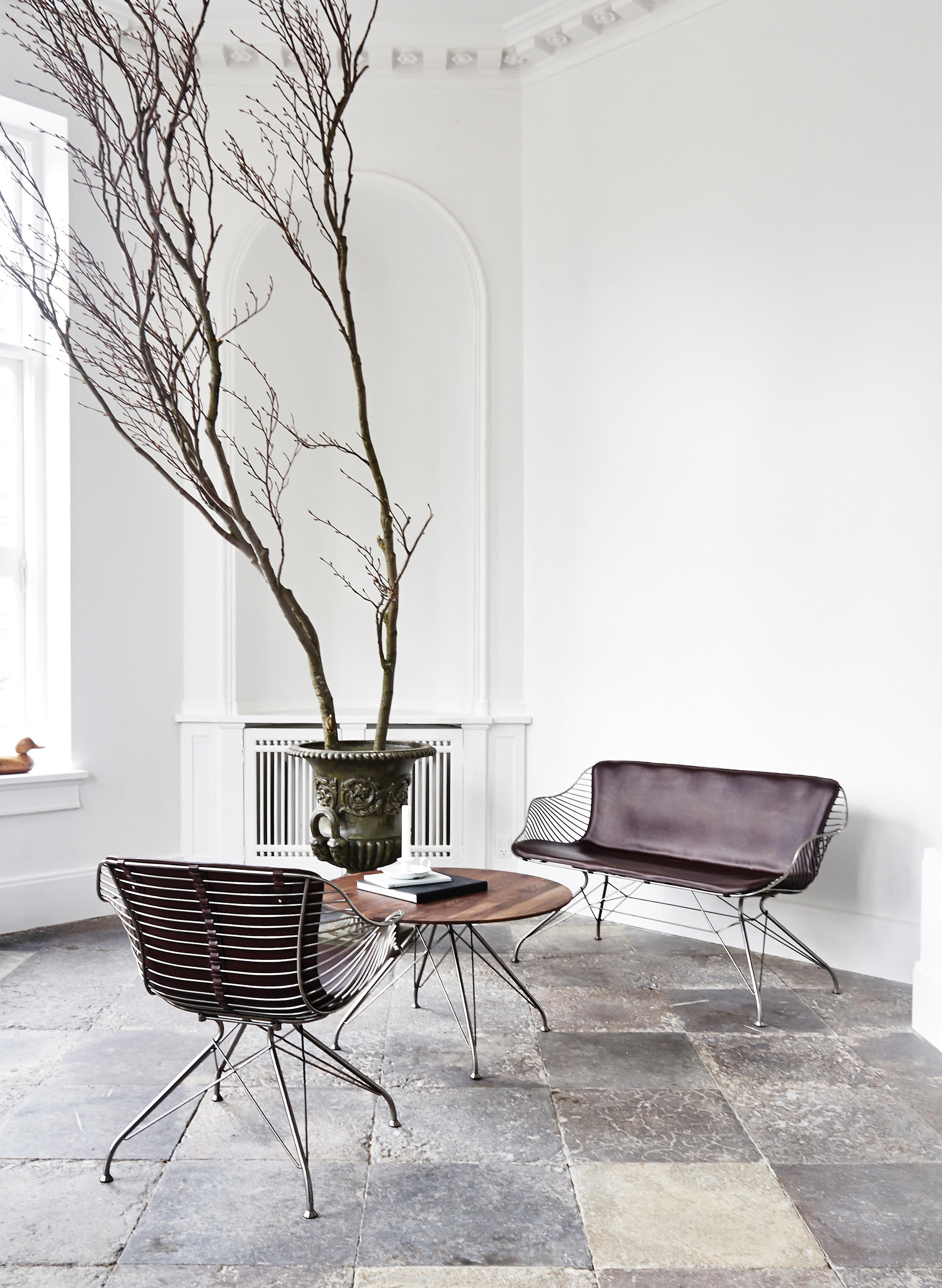 金属丝茶几由Jasper Overgaard和Christian Dyrman设计。2014年设计的金属丝躺椅是一种更低、更宽、更平放的版本,与铁丝餐椅相比。