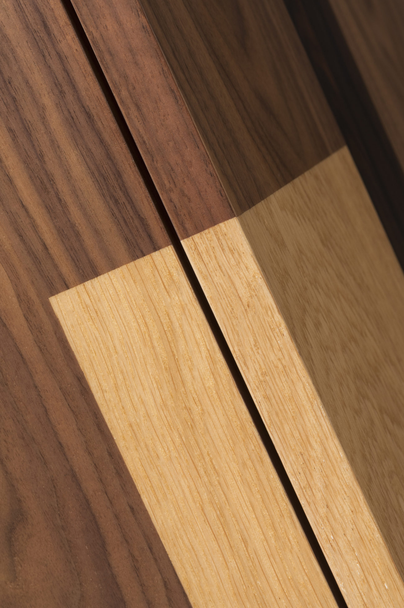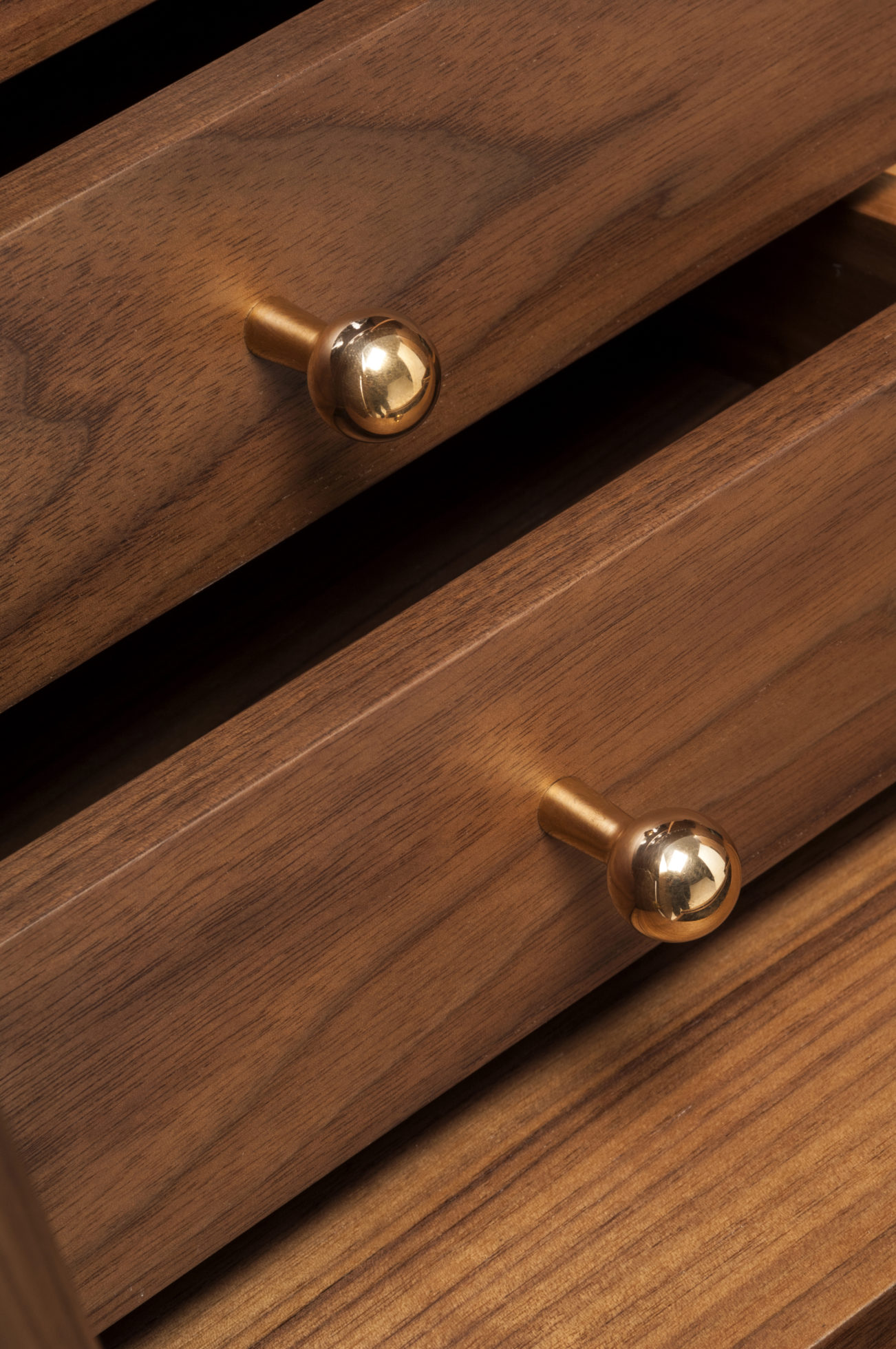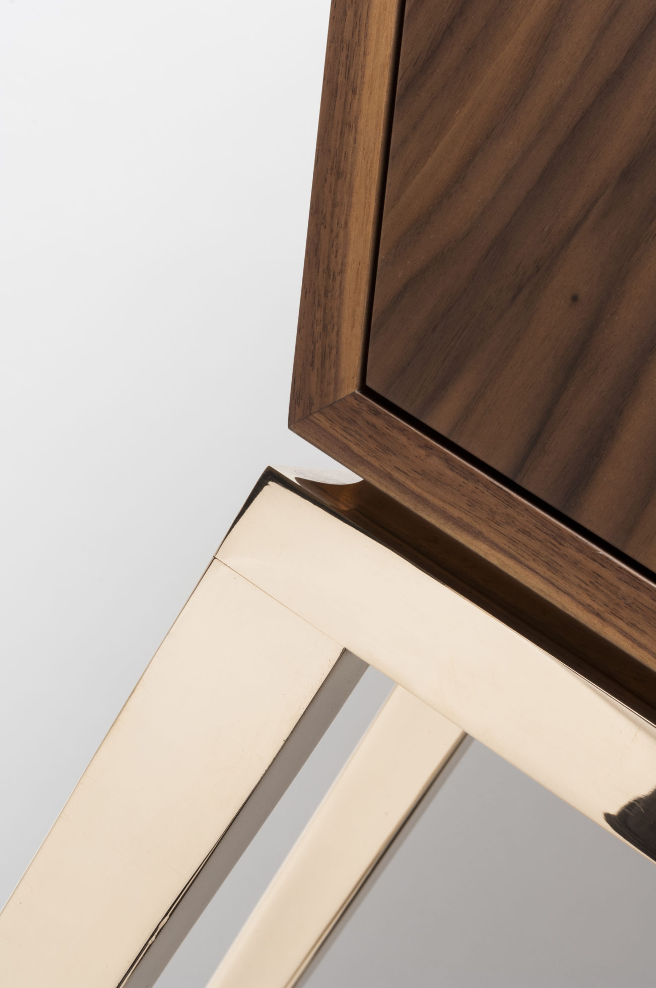 这是一款温文尔雅的饮料柜,采用美国黑胡桃木制成,带有ziricote和橡木镶板以及坚固的抛光青铜腿背板和把手。