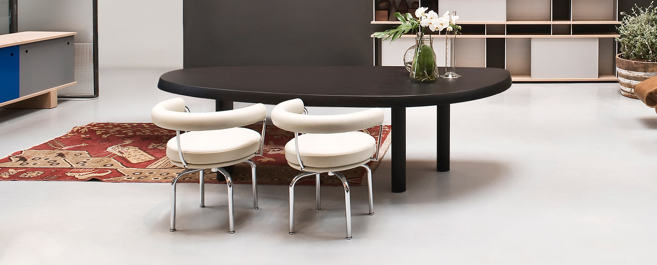 圆面实木面桌。构成桌面的木头拥有明显的侧接点。三条支撑桌腿,一条呈椭圆形的桌腿较大,链条圆柱形的桌腿较小。开孔黑漆橡木或桃花心木饰面。该系列的第一款桌子是于1938年为自己在Montparnasse的工作室设计的,圆形不对称的形状正好适于有限的空间,还突出制作桌子所用木头的天然美丽。因为这款桌子没有棱角,所以可以坐下许多人,是欢乐聚会的好选择。该款桌子采用经受外部因素变化的天然材料,例如:日照、温度、湿度和日常使用。在这款桌子中,不将此类变化视为不利因素,而将其视为材料的独特性,强调天然美丽。