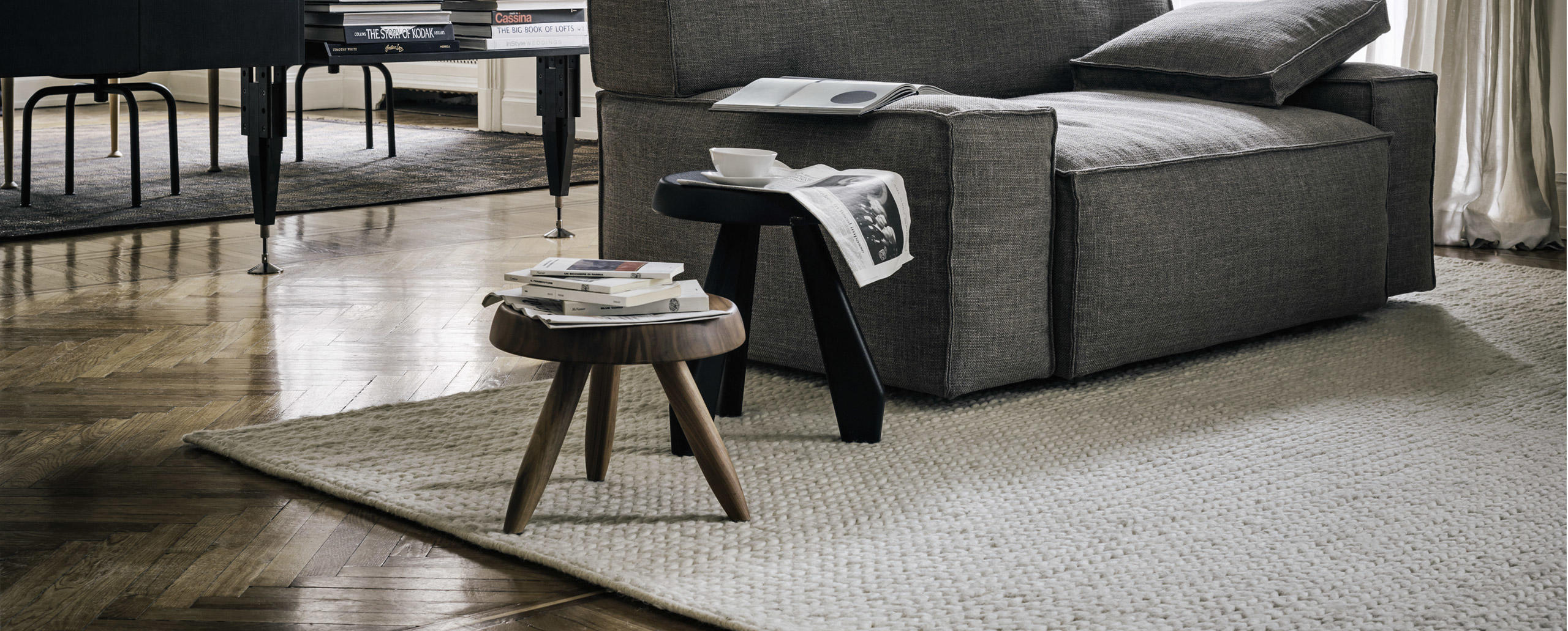 Tabouret Meribel 高脚凳,得名于Charlotte Perriand在法国美贝尔的度假屋。Perriand在这里工作和生活,多年来,她重新诠释了当地的建筑风格。这把凳子材质简单,从阿尔卑斯山的建筑风格中获得灵感。该凳采用三条“刀把型”凳腿,提供三种不同实木饰面:天然橡木、哑光黑色橡木和天然美国胡桃木。