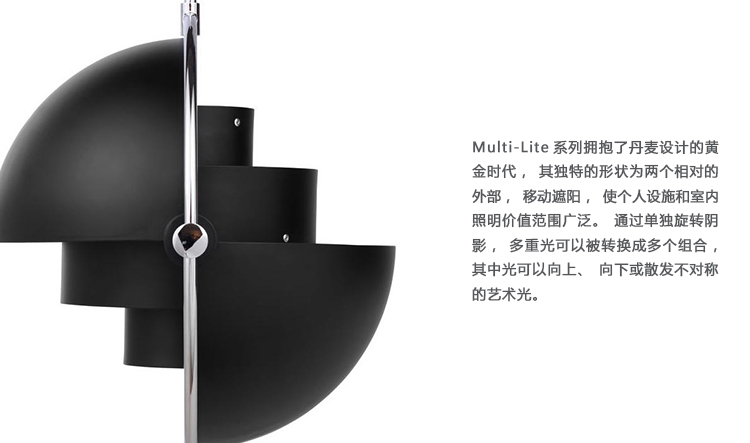 多元文化系列拥抱了丹麦设计的黄金时代,其独特的形状为两个相对的外部,移动遮阳,使个人设施和室内照明价值范围广泛。通过单独旋转阴影,多重光可以被转换成多个组合,其中光可以向上、向下或散发不对称的艺术光。