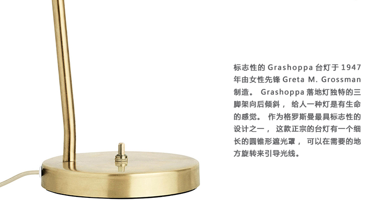 标志性的Grashoppa台灯于1947年由女性先锋Greta M. Grossman制造。Grashoppa落地灯独特的三脚架向后倾斜,给人一种灯是有生命的感觉。作为格罗斯曼最具标志性的设计之一,这款正宗的台灯有一个细长的圆锥形遮光罩,可以在需要的地方旋转来引导光线。