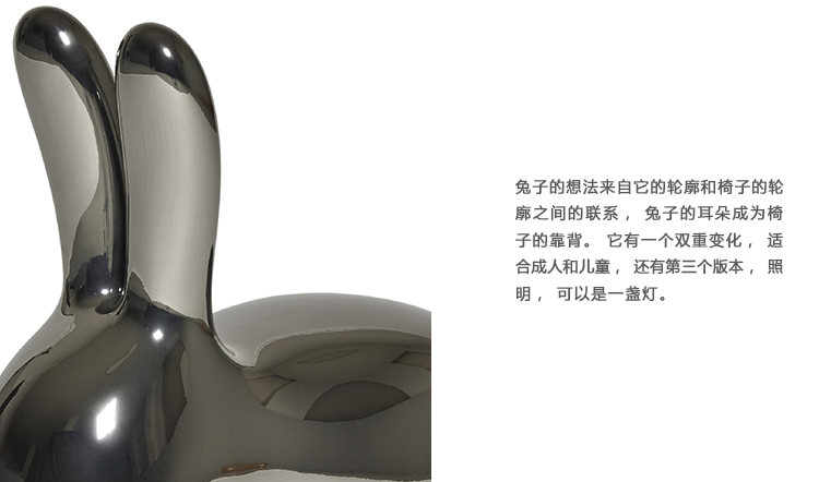 “兔椅(Rabbit Chair)”是Stefano Giovannoni魔术帽的最后一个创作,它成为具有强大的交流媒体力量的产品系列。 兔子的想法来自它的轮廓和椅子的轮廓之间的联系,兔子的耳朵成为椅子的靠背。 它有一个双重变化,适合成人和儿童,还有第三个版本,照明,可以是一盏灯。 年轻人和老年人可以坐下来靠在兔子的耳朵上,或者在对面,骑着它并将手臂靠在耳朵上。 兔子是一种温柔的动物,可爱而温柔。 在西方和东方文化中,它象征着爱和生育,它是一个甜蜜和吉祥的对象,带来了好运和美好的愿望。