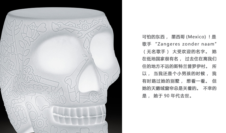可怕的东西,墨西哥(Mexico)!是歌手“Zangeres zonder naam”(无名歌手)大受欢迎的名字。她在低地国家很有名,过去住在离我们住的地方不远的Stramproy(斯特兰普罗伊)村。所以,当我还是个小男孩的时候,我有时路过她的别墅,想看一看。但她的天鹅绒窗帘总是关着的。不幸的是,她于90年代去世。