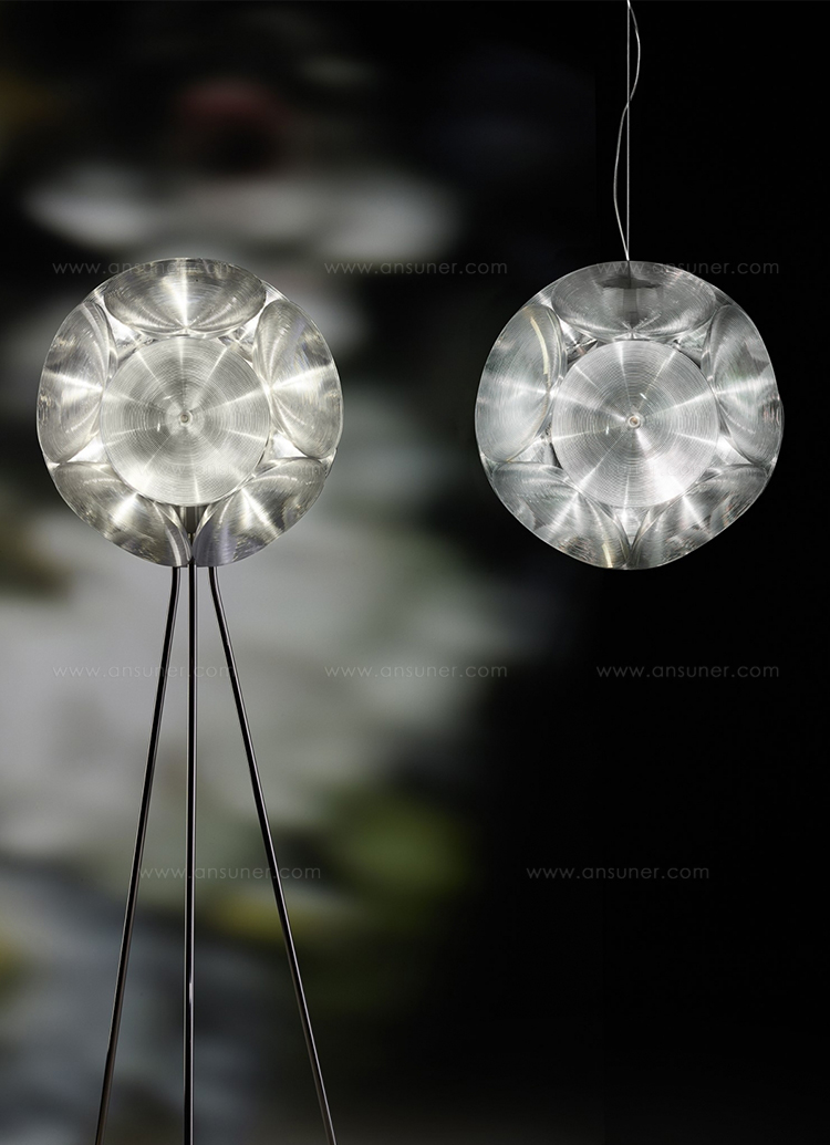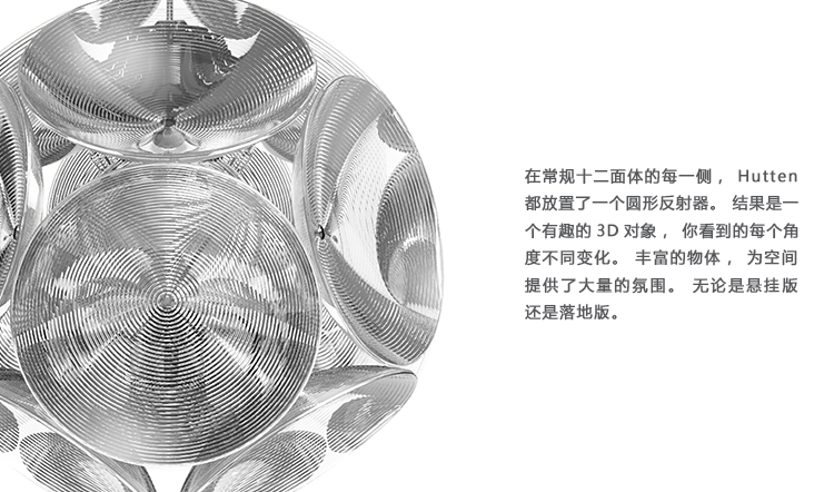 在常规十二面体的每一侧,Hutten都放置了一个圆形反射器。 结果是一个有趣的3D对象,你看到的每个角度不同变化。 丰富的物体,为空间提供了大量的氛围。 无论是悬挂版还是落地版。