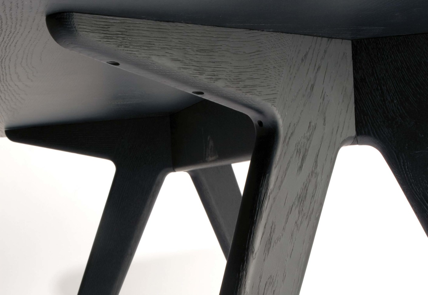 板形餐桌可使用自然漆或黑色漆完成。保留橡木的自然美,板坯收集是一系列以诱人的简洁的角度形式建造坚固的作品。表面被刷得很深,露出了颗粒。用黑色或天然漆完成。板坯收集包括一个酒吧凳子,椅子和桌子。