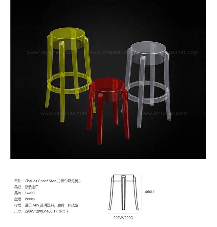 "Charles Ghost Stool(查尔斯鬼凳),由鼎鼎大名Philippe starck(菲利浦·史塔克)设计;进口高透明度工程塑料PC一体成型,简洁新潮,高净度透明材质很好的表现出产品的时尚和百搭,可以毫不夸张的说,几乎配任何装修风格他都很灵,而且显品味,空间感也很好,如果你的吧台空间不大的话,放这款吧椅视觉很通透,不占地方。"