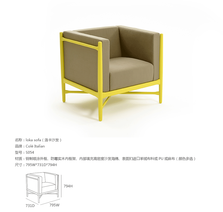 Loka Sofa(洛卡沙发)是设计师Catharina Lorenz和Steffen Kaz的作品,优雅、时尚,舒适,立体,具有个性。加高的脚型拉大脚架的比例,刻意凸显其优美的线条,是款用来休憩放松的沙发首选,现代感兼具舒适功能,无论是居家或公共空间都非常适合。制作采用钢制喷涂外框、防霉实木内框架、内部填充高密度沙发海绵、表面扪进口羊绒布料或PU或麻布(颜色多选)。