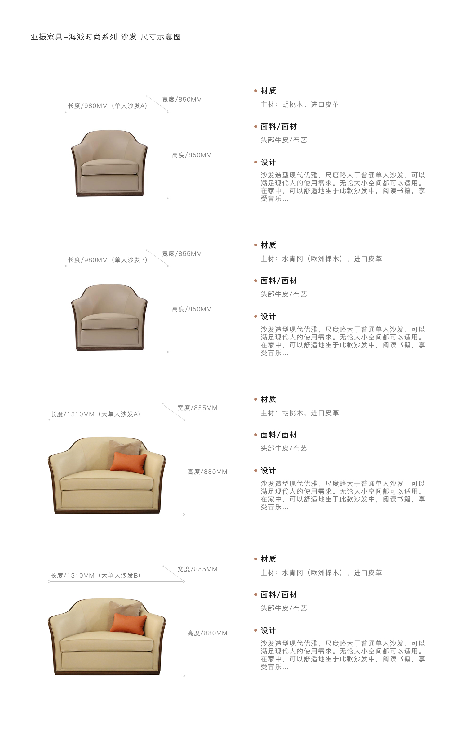 沙发造型现代优雅,尺度略大于普通单人沙发,可以满足现代人的使用需求。无论大小空间都可以适用。在家中,可以舒适地坐于此款沙发中,阅读书籍,享受音乐…