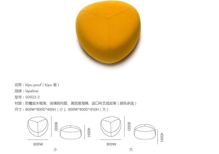 Kipu Pouf(Kipu 墩)的设计来着两个年轻的挪威设计师Torbjorn Anderssen和Espen Voll,灵感来自自然元素,被河水打磨的光滑鹅卵石,这就产生了三角形装卵石样的Kipu 墩。制作采用防霉实木框架、玻璃钢内胆、高密度海绵、高级布艺或皮革(颜色多选),软化所选择的颜色和面料,缝线细致的相交缝制,给人正式又休闲的感觉。其实用性非常广,可用于工作场所、非正式会议区、等候区、图书馆,也可以用在住宅项目,仿若舒适的"孤岛",可以不同高度、数量自由组合,即便不用来坐,单纯用来做艺术摆设都是非常高档的。