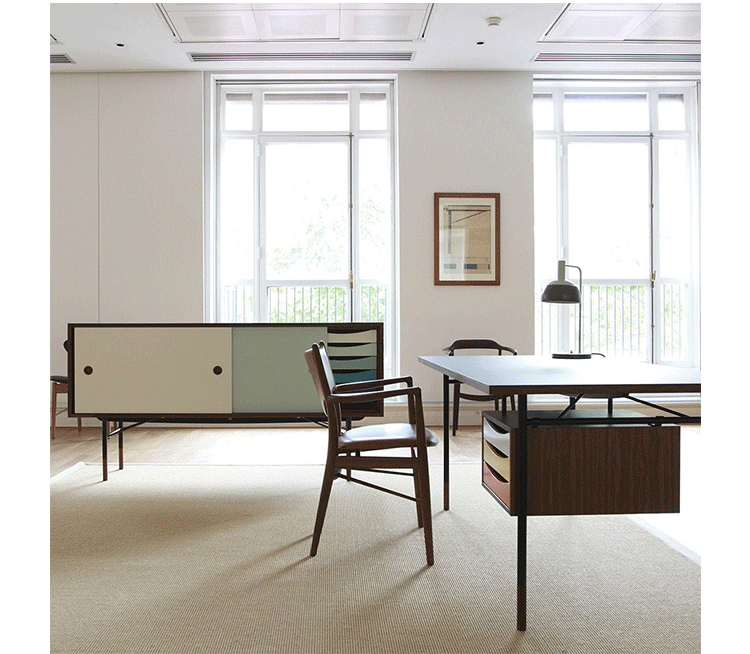 color theory sideboard(色彩理论餐边柜)是设计师Juhl Finn设计的,Kardiel公司制作的经典实木家具,1940年,他设计的第一张座椅、也是最经典的作品——《鹈鹕椅》(Pelican Chair),目前为纽约现代艺术博物馆 MOMA 所珍藏。彩色的滑动门与托盘餐具柜是1955年由Juhl Finn为BOVIRKE设计的。)是Kardiel公司制作的经典实木家具。复古但永不过时的木炭是和橙色,结合美国核桃开创了20中世纪六十年代中现代主义的时代。在现代主义的存储家具上, Finn Juhl和 Arne Vodder 最先尝试胶木和天然木的组合运用。这是大胆的创新,他们结合传统的新鲜的新兴技术与现代主义的概念。他们通过这些色彩绚烂的产品所实现的是令人印象深刻的比例的平衡。制作采用精选MDF板基材胡桃木皮或水曲柳贴面、五金脚架、环保油漆喷涂、做工精湛。颜色元素的使用反映了他迷恋歌德的著名彩色圈,颜色处于和谐的凝聚力。
