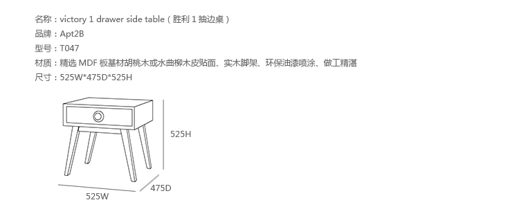 victory 1 drawer side table(胜利1抽边桌)是Apt2B公司设计的经典实木家具,设计简单但绝对的华丽,配置1个平滑抽屉,提供许多存储空间,可以存储方便您存储自己的物品,制作采用精选MDF板基材胡桃木或水曲柳木皮贴面、实木脚架、环保油漆喷涂、做工精湛。