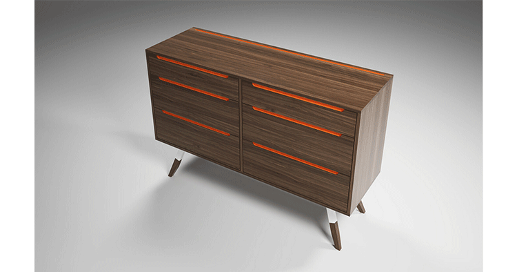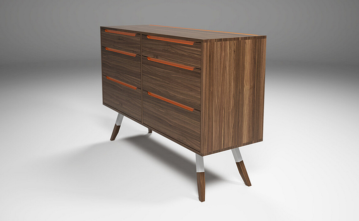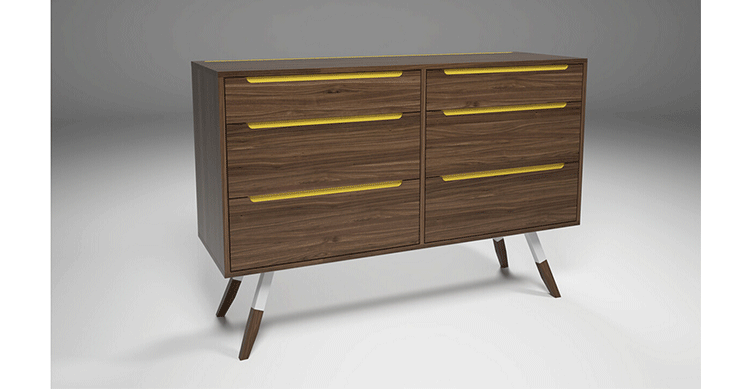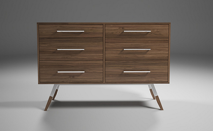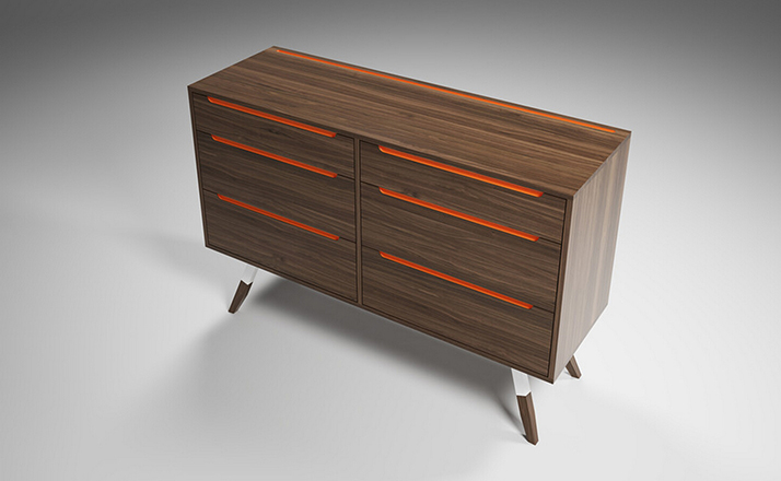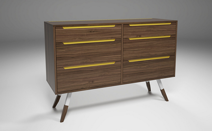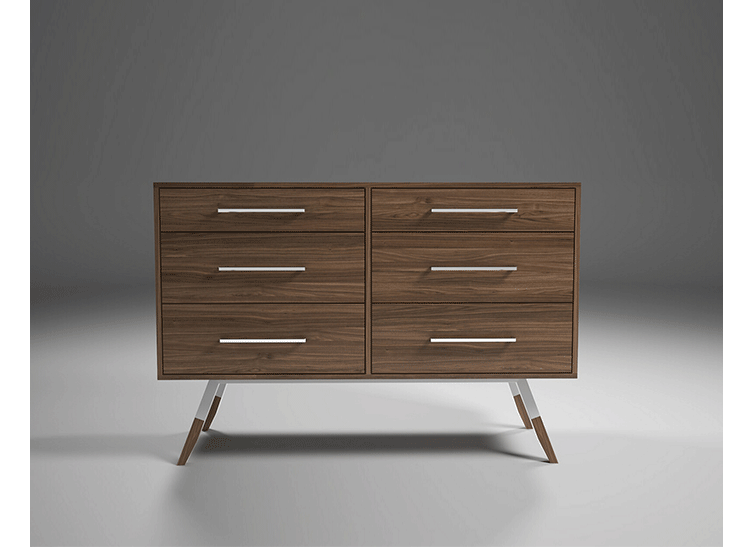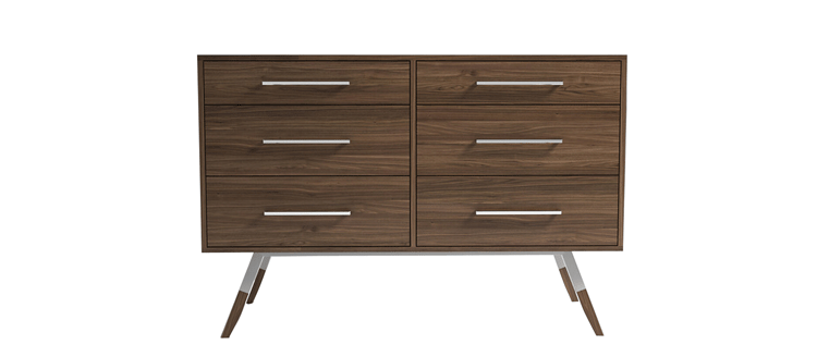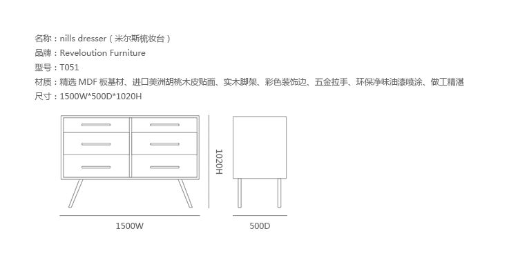 nills dresser(米尔斯梳妆台)能够很好的组织你的衣物,平滑抽屉够大够深,再多的衣物也能很好的存放。制作采用精选MDF板基材、进口美洲胡桃木皮贴面、实木脚架、彩色装饰边、五金拉手、环保净味油漆喷涂、做工精湛。
