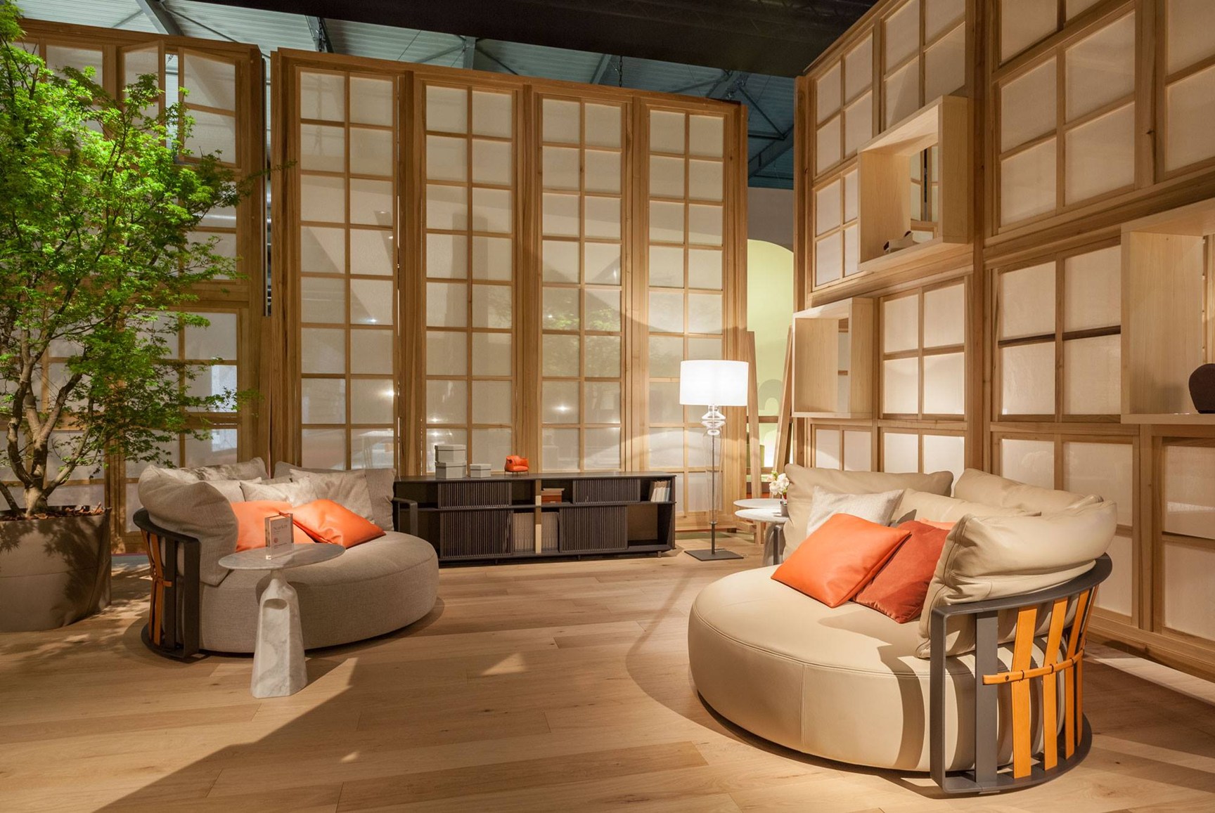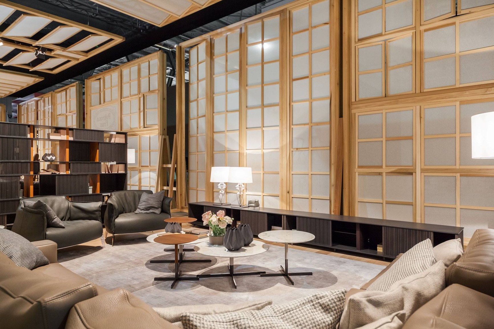 一系列的薄垂直木制棒光网格形式,无形的水平轨道上运行从上到下。 每个网格可以根据需要创建不同的序列。 固体和空洞的分数波动,光与影。 一个好玩的游戏,允许的内容、书籍和对象,没有完全揭示。 最先进的技术结合传统材料,木材和马鞍皮革,形成一个固体和简约的结构。
