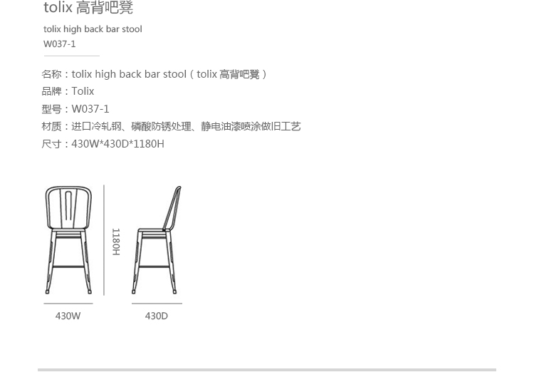 tolix chair(tolix椅)一把有味道、有态度的椅子,据说它最开始被使用在一艘战舰的天气预报房间里,故事的真实性与否不得而知,但是不影响其成为享誉世界的著名设计家具,1934年由Xavier Pauchard设计,早期是作为户外用家具设计,力图展现法式慵懒而闲适的气质,经年而来被全世界时尚设计师所宠爱,从室外扩展到家居、商业、展示等多个用途,而此椅也不负众望在各类空间中均有上佳表现,特别是近年来与混搭、乡村、美式、怀旧、北欧简约、中式等主要装修风格搭配,都呈现出独特的韵味,也被时尚界赞为“百搭第一”椅,可以用在酒吧,餐馆,咖啡馆等等地方,之后通过改进,设计出有扶手版本的tolix armchair(tolix扶手椅),高背版本的tolix high back bar stool(tolix高背吧凳),宽背版本的tolix wide back bar stool(tolix宽背吧凳),及tolix bar stool(tolix吧凳)和tolix mini stool(tolix迷你凳)。制作采用进口冷轧钢、磷酸防锈处理、静电油漆喷涂工艺、坐面为木板或PU海绵坐垫,颜色可选。