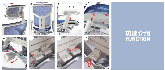 4、底盘:多功能线控底盘,座垫可高低与座深调整,背可后仰,座旁式后仰弹力调整,令使用者腿部与背部更平衡,自然而倍感舒适。