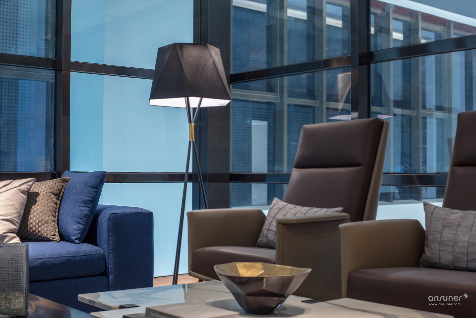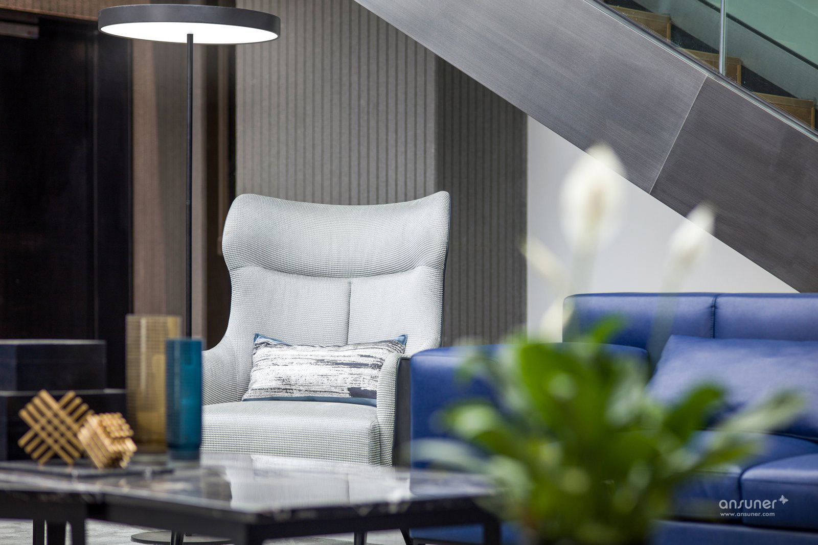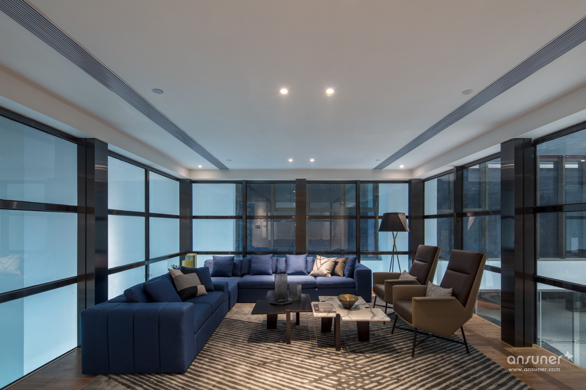 一层大堂接待空间注重商务感受,因此以黑、白及高级灰色调为主,沉稳中偶尔又跳出一些蓝、黄色的活泼。设计手法上为了搭配空间的层高和布局,体现未来感与创新感,运用了很多几何与线条的元素,无论是在家具款式、吊顶装置还是饰品中都可以看到。